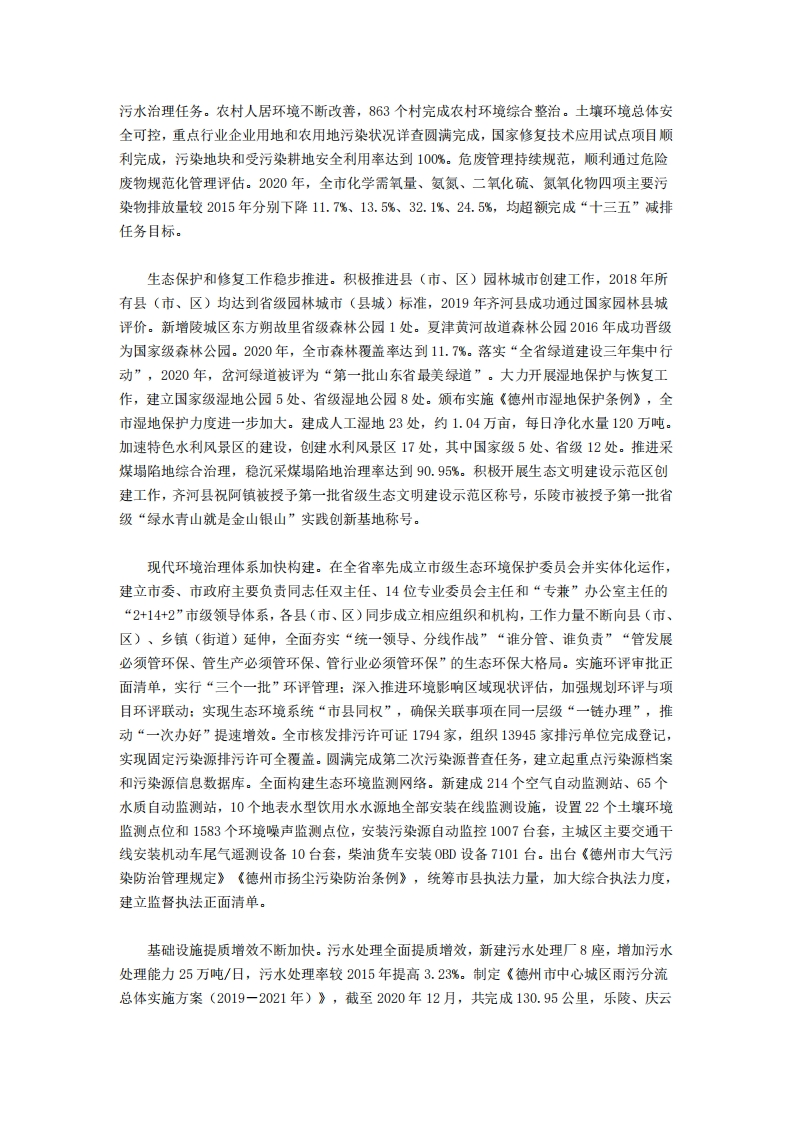 德州市“十四五”生态环境保护规划第一章开启美丽新德州建设新征程“十四五”时期是开启全面建设社会主义现代化国家新征程、向第二个百年奋斗目标进军的五年,也是德州市深入贯彻落实习近平生态文明思想、落实黄河流域生态保护和高质量发展、加快实现德州绿色高质量发展和生态环境高水平保护的关键五年。第一节生态环境保护取得突出成效“十三五”时期,全市生态环境系统深入学习宣传贯彻习近平生态文明思想,认真落实党中央、国务院坚决打好污染防治攻坚战的决策部署和省委、市委工作要求,协同推进经济高质量发展和生态环境高水平保护,污染防治力度不断加大,环境治理体系更加完善,治气治水治土治废成效明显,环境质量稳定改善,“十三五”生态环境保护规划和污染防治攻坚战目标任务如期高质量完成,厚植了我市全面建成小康社会的绿色底色,人民群众获得感、幸福感明显增强,建设生态宜居美丽新德州迈出坚实步伐。绿色发展成效明显。推动落后产能有序退出,2018一2020年淘汰(替换)49家企业的落后设备共计87台(套),完成5家危化品生产企业搬迁改造。大力调整能源结构。煤炭消费压减任务全面完成。全市新能源和可再生能源发电总装机达411.95万千瓦,占电力总装机的54.15%.2020年实现新能源发电量43.54亿千瓦时,占全社会用电量比重达到17.32%。全市完成3706台燃煤锅炉淘汰,完成“气代煤、电代煤”改造44万户,全市平均清洁取暖率达到70%以上,农村地区平均清洁取暖率达到55%左右。新旧动能转换有力推进。2020年,三次产业比例达到10.6:40.2:49.2,第三产业比2015年提高了6.2个百分点。全市高新技术产业产值占工业总产值比重提高到43.06%。五大战略新兴产业主营业务收入占规模以上工业比重达到39.17%,利润总额占比达到45.2%。绿色制造体系初步形成。8家企业入选工业和信息化部前四批绿色制造示范单位名单。实施工业园区循环化改造,加强余热余压废热资源的回收利用和水资源循环利用,大力发展再制造产业,提高工业“三废”综合利用水平。积极培育和发展农业“新六产”,成功认定4个粤港澳大湾区“菜篮子”生产基地,建设农业“新六产”示范县8个、示范主体74家。“绿色建造”变革进一步加快。全市节能建筑累计竣工面积2750万平方米,完成公建节能改造项目23个,新建建筑执行绿色建筑设计标准面积4600万平方米,开工装配式建筑面积221万平方米,成功创建2个省级装配式建筑示范城市,德建集团通过国家级装配式建筑产业基地认定。生态环境质量持续向好。P2.5平均浓度较2015年改善49%,改善幅度列全省第1位。环境空气质量综合指数较2015年改善39.1%,改善幅度列全省第2位。国控地表水考核断面优良水体比例较2015年提升25个百分点,提升幅度居全省第2位,在山东省海河流域河流中率先实现突破。地级及以上饮用水水源地全部符合地表水Ⅲ类标准:超额完成农村生活