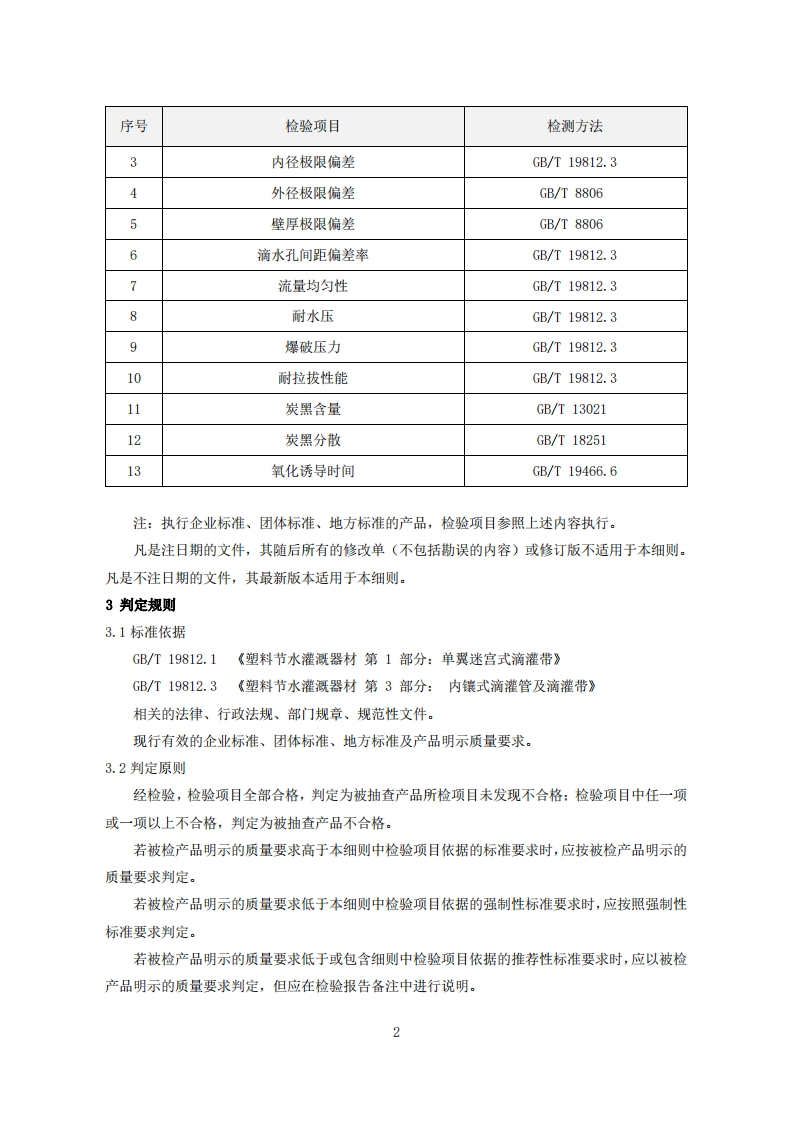 济南市滴灌带(管)产品质量监督抽查实施细则(2025年版)1抽样1.1抽样方法以随机抽样的方式在被抽样生产者、销售者的待销产品中抽取。随机数一般可使用随机数表等方法产生。每批次产品抽取完整包装的样品1卷(每卷长度大于等于1000米),现场将抽取到的1卷滴灌带去除外表层10米后,截取两份200米长的样品,分别标记为1号和2号,其中1号作为检验样品,2号作为备用样品。2检验项目及检测方法表1单真迷宫式滴灌带产品检验项目及检测方法序号检验项目检测方法1外观GB/T19812.12不透光性GB/T19812.13内径极限偏差GB/T19812.14壁厚极限偏差GB/T19812.15滴水孔间距偏差率GB/T19812.16流量均匀性GB/T19812.17耐水压GB/T19812.18爆破压力GB/T19812.19耐拉拔性能GB/T19812.110炭黑含量GB/T1302111炭黑分散GB/T18525112氧化诱导时间GB/T19466.6表2内镶式滴灌管及滴灌带产品检验项目及检测方法序号检验项目检测方法1外观GB/T19812.32不透光性GB/T19812.3