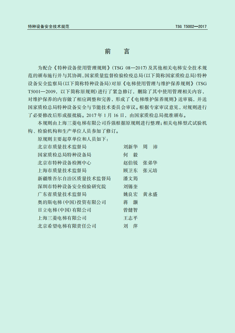 电梯维护保养规则TSGT5002-2017348072@abc4个月前发布关注私信0.49MB20页026电梯维护保养规则TSGT5002-2017此内容为付费资源,请付费后查看¥15¥23黄金会员免费钻石会员免费立即购买您当前未登录!建议登陆后购买,可保存购买订单付费资源 第1页 / 共20页 第2页 / 共20页 试读已结束,还剩18页,您可下载完整版后进行离线阅读 THE END标准规范 文本预览 TSG特种设备安全技术规范TSGT5002-2017电梯维护保养规则Lift Maintenance Regulation中华人民共和国国家质量监督检验检疫总局颁布2017年1月16日 查看更多 收起部分 喜欢就支持一下吧收藏