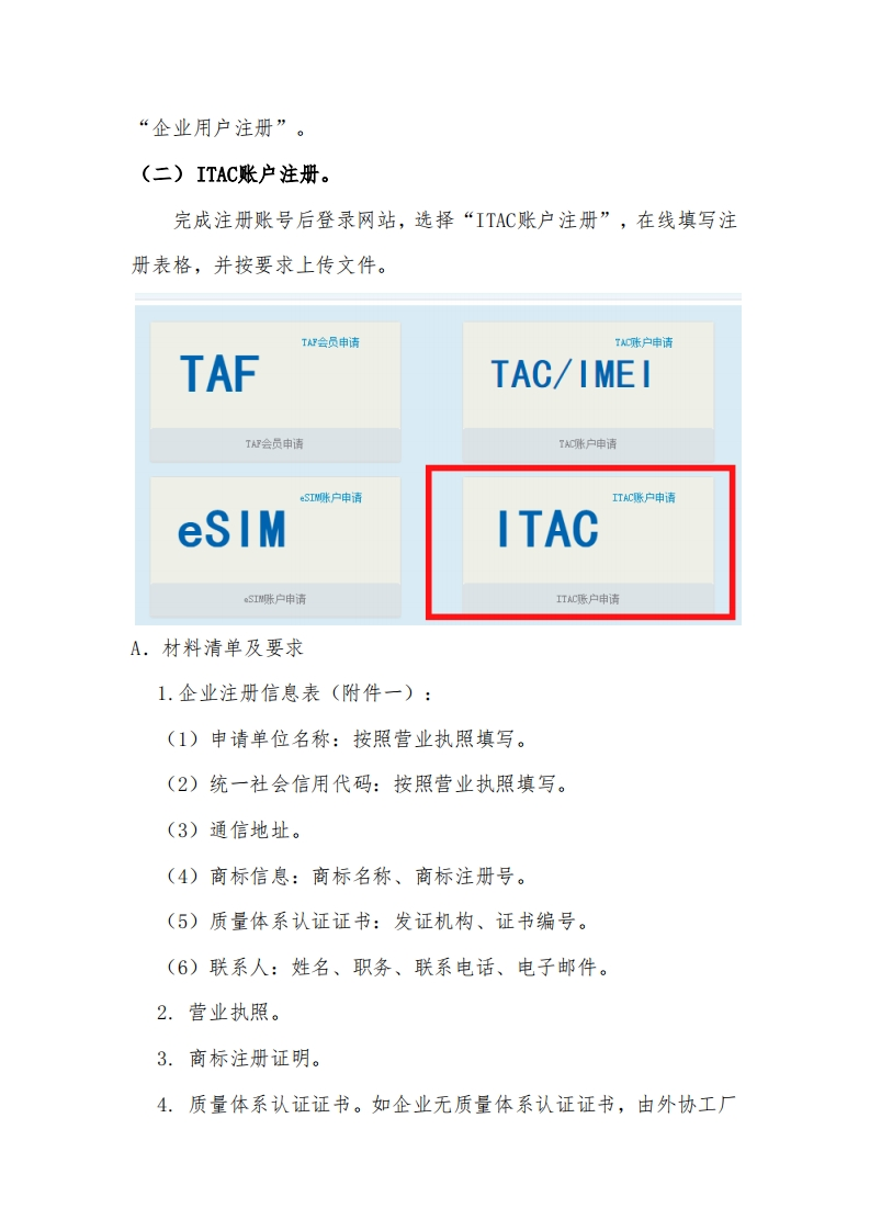 电信终端产业协会ITAC核发服务指南UIDI(Unified IoT Device Identity)即物联网设备统一编码,用以标识在中国境内地区销售使用的所有物联网设备(包含蜂窝和非蜂窝通信方式)。UIDI由15位数字组成,分为ITAC(IoT TypeAllocation Code,物联网型号分配码)、SNR(Serial Number,序列号)和CD(Check Digit,校验码)三个组成部分。电信终端产业协会(TAF)是国内唯一的ITAC核发管理机构。一、适用范围根据《物联网设备统一编码方法》(T/TAP072-2020),所有物联网设备(蜂窝类物联网设备所使用的独立通信单元需办理进网许可)生产企业均可向TAF提交ITAC申请,由TAF负责企业ITAC账户注册和申请的审批工作。ITAC申请不收取任何费用。二、ITAC申请与核发管理流程(一)TAF网站注册。TF电信终端产业协会atorg.cn tat.net.c首页协会银况标准眼务协会会员通知公告新间态智的端汗测应用承欧件梯测请输入关储字QA协会新问一关于召开移用户专区浦酸理事长参加2019上海世界移动大会并为:5IⅢ论坛致辞用户名01年中月-0日,以“智万物”为主型的“01世界移动大会上喜”在上国际博阅中心石开,T诗会避事长正水加·比丙正合适量国正式发5所商同件解不久后开,验江码47805换-强形技在全远四的端日应用成为塘点(5所1始)·避事长详了华为、中国会员登录MWC通、死立信得企业展台,听取头专家5所预技代新让势新应的价。【详注号执回密码登录TAF网站(mw.taf.org.cn),点击首页“注册账号”,选择