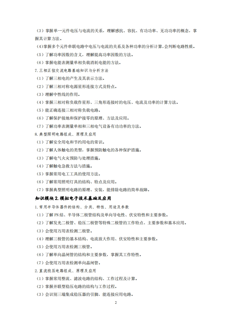 电子技术类专业知识考试标准一、考试范围和要求知识模块1.电工技术基础及应用1.电路的基础知识(1)了解电路的基本组成及各部分的作用、电路的状态及特点。(2)理解电路常用物理量的概念、简单计算及测量。(3)理解电阻元件的参数、电阻定律,会识读和测量电阻。(4)掌握部分电路、全电路欧姆定律。2.直流电路分析方法(1)理解电阻串联、并联的连接方式及电路特点。(2)掌握混联电路的等效电阻、电流、电压及电功率的计算。(3)了解支路、节点、回路、网孔的定义。(4)掌握基尔霍夫电压定律和基尔霍夫电流定律,会用支路电流法求解电路。(5)理解戴维宁定理和叠加定理,并会简单求解。3.电容与电感的知识及应用(1)了解电容的概念、电容器的参数及其用途。(2)了解电容器的连接特点,会识读电容器标识。(3)理解电容器的充放电特性,会用万用表检测较大容量的电容器。(4)了解电感的概念、分类及参数。4.磁路基础知识(1)了解磁场及其主要物理量。(2)理解安培定则,会判断电流的磁场方向。(3)理解安培力及左手定则(4)了解铁磁性物质及磁路的主要物理量。5.电磁感应、自感及互感原理与应用(1)理解电磁感应现象产生的条件及法拉第电磁感应定律。(2)会用右手定则和楞次定律判断感应电流的方向。(3)理解自感现象及其应用。(4)理解互感现象及其应用。(5)了解互感线圈的同名端。6.单相正弦交流电路基础知识与分析方法(1)理解正弦交流电的基本概念,掌握其三要素。(2)理解正弦量的解析式、波形图、矢量图及三者间的相互转换。1
