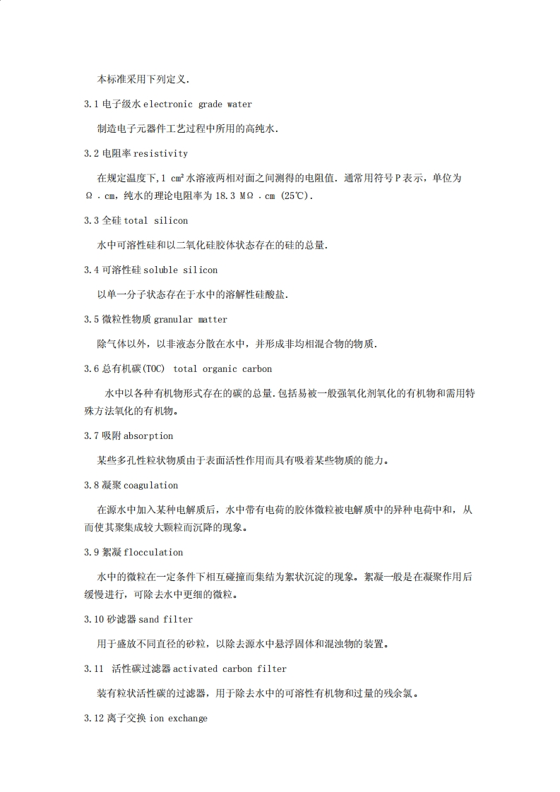 中华人民共和国国家标准GB/T11446.1-1997电子级水代替GB11446.1-89Electronic grade water1范围本标准规定了电子级水的级别、要求、试验方法和检验规则.本标准适用于电子元器件生产和清洗用水.2引用标准下列标准所包含的条文,通过在本标准中引用丽构成为本标准的条文.本标准出版时,所示版本均为有效.所有标准都会被修订,使用本标准的各方应探讨使用下列标准最新版本的可能性。GB/T11446.3一一1997电子级水测试方法通则GB/T11446.4一一1997电子级水电阻率的测试方法GB/T11446.5一一1997电子级水中痕量金属的原子吸收分光光度测试方法GB/T11446.6一一1997电子级水中二氧化硅的分光光度测试方法GB/T11446.7一一1997电子级水中痕量氯离子、硝酸根离子、磷酸根离子、硫酸根离子的离子色谱测试方法GB/T11446.8一1997电子级水中总有机碳的测试方法GB/T11446.9一一1997电子级水中微粒的仪器测试方法GB/T11446.10一一1997电子级水细菌总数的滤膜培养测试方法3定义