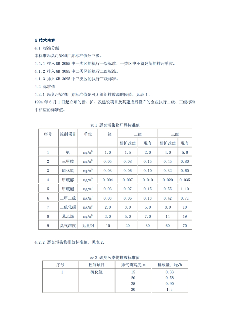 恶臭污染物排放标准GB14554-93代替GBJ4-73(1993年7月19日国家环境保护局批准1994年1月15日实施)为贯彻《中华人民共和国大气污染防治法》,控制恶臭污染物对大气的污染,保护和改善环境,制定本标准。1主题内容与适用范围1.1主题内容本标准分年限规定了八种恶臭污染物的一次最大排放限值、复合恶臭物质的臭气浓度限值及无组织排放原的厂界浓度限值。1.2适用范围本标准适用于全国所有向大气排放恶臭气体单位及垃圾堆放场的排放管理以及建设项目的环境影响评价、设计、竣工验收及其建成后的排放管理。2引用标准GB3095大气环境质量标准GB12348工业企业厂界噪声标准GB/T14675空气质量恶臭的测定三点比较式臭袋法GB/T14676空气质量三甲胺的测定气相色谱法GB/T14677空气质量甲苯、二甲苯、苯乙烯的测定气相色谱法GB/T14678空气质量硫化氢、甲硫醇、甲硫醚、二甲二硫的测定气相色谱法GB/T14679空气质量氨的测定次氯酸钠一水杨酸分光光度法GB/T14680空气质量二硫化碳的测定二乙胺分光光度法3名词术语3.1恶臭污染物odor pollutants指一切刺激嗅觉器宫引起人们不愉快及损坏生活环境的气体物质。3.2臭气浓度odor concentration指恶臭气体(包括异味)用无臭空气进行稀释,稀释到刚好无臭时,所需的稀释被数。3.3无组织排放源指没有排气筒或排气筒高度低于15m的排放源。