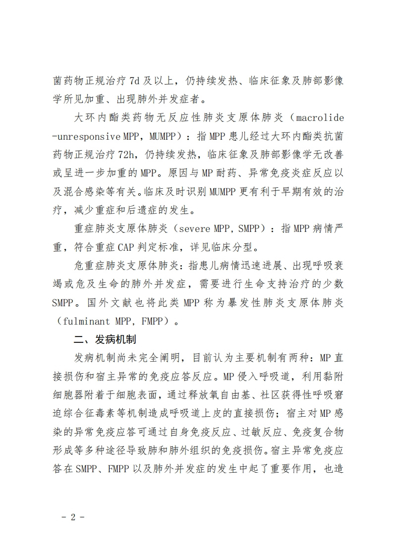 儿童肺炎支原体肺炎诊疗指南(2023年版)肺炎支原体肺炎(mycoplasma pneumoniae pneumonia,MPP)是我国5岁及以上儿童最主要的社区获得性肺炎(communityacquired pneumonia,CAP)。如何早期发现重症和危重症病例、合理救治、避免死亡和后遗症的发生是MPP诊治的核心和关键问题。为此,国家卫生健康委员会委托国家儿童医学中心(首都医科大学附属北京儿童医院)牵头撰写儿童MPP诊疗指南。国家儿童医学中心组织了国家呼吸病临床研究中心、全国儿科呼吸、重症、血液、影像、检验、药学等多学科专家,参照现有国内外证据和经验制定了本诊疗指南,以期指导和规范儿科医师对MPP的诊治,减少抗微生物药物的不合理使用,减少后遗症、降低病死率、减轻医疗负担等。本指南为总体指导性原则,各地各级医院在临床实践中应结合具体情况运用。一、定义肺炎支原体肺炎(MPP):指肺炎支原体(mycoplasmapneumoniae,MP)感染引起的肺部炎症,可以累及支气管、细支气管、肺泡和肺间质。难治性肺炎支原体肺炎(refractory mycoplasmapneumoniae pneumonia,RMPP):指MPP患儿使用大环内酯类抗-1-