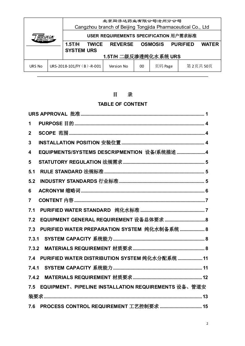 北京同济达药业有限公司沧州分公司Cangzhou branch of Beijing Tongjida Pharmaceutical Co.,Ltd了园USER REQUIREMENTS SPECIFICATION用户需求标准6p.01.5T/H TWICEREVERSE OSMOSIS PURIFIEDWATERSYSTEM URS1.5TH二级反渗透纯化水系统URSURS NoURS-2018-101/FY(B)-R-001Version No00页码Page第1页共50页URS APPROVAL批准以下指定的人员签名、签日期后,证明本文件《用户需求标准》生效,可以执行。制定Prepared by部门Department职位Position签名Signature日期Date工程设备部设备管理员审核Reviewed by部门Department职位Position签名Signature日期Date生产制造部部长环境安全部部长工程设备部部长质量管理部部长批准Approved by部门Department职位Position签名Signature日期Date质量管理部质量负责人