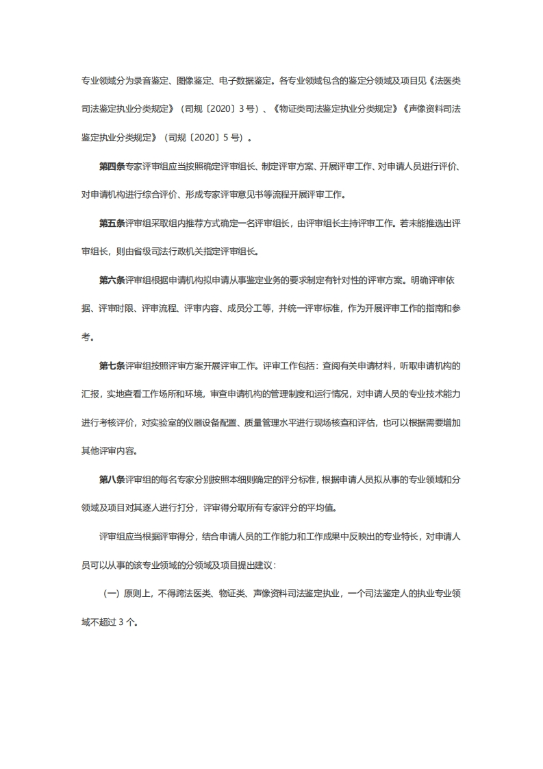各省、自治区、直辖市司法厅(局),新疆生产建设兵团司法局:《法医类物证类声像资料司法鉴定机构登记评审细则》已经2021年5月26日第9次部长办公会议审议通过,现予印发,请认真贯彻执行。司法部2021年6月15日法医类物证类声像资料司法鉴定机构登记评审细则第一条为进一步加强对同法鉴定机构和鉴定人准入登记的审核,规范专家评审工作,根据《全国人民代表大会常务委员会关于司法鉴定管理问题的决定》《司法鉴定机构登记管理办法》(司法部令第95号)、《司法鉴定人登记管理办法》(司法部吟第96号)、《关于<司法鉴定机构登记管理办法>第二十条、<司法鉴定人登记管理办法>第十五条的解释》(司规〔2020]4号)等规定,制定本细则。第二条省级司法行政机关应当按照《行政许可法》、司法部令第95号、第96号和司规〔2020]4号等规定,对申请从事法医类、物证类、声像资料司法鉴定业务的法人或者其他组织(以下简称申请机构)、人员(以下简称申请人员)的申请材料进行认真审查,根据审查结果,按照法定时限出具书面受理决定书或者不予受理决定书。决定受理的,省级司法行政机关应当于十五个工作日内组织评审专家开展评审工作第三条省级司法行政机关应当选取相关的评审专家,分别按法医类、物证类、声像资料司法鉴定的专业领域组建专家评审组,每个专业领域的专家评审组人数不少于5人且为单数。评审专家原则上应为具备高级职称的鉴定人,执业范围应包含被评审的专业领域。评审组专家的专业能力应覆盖被评审的所有专业分领域及项目。法医类司鉴定评审专业领域分为法医病理鉴定、法医临床鉴定、法医精神病鉴定、法医物正鉴定、法医毒物鉴定。物证类司法去鉴定评审专业领域分为文书鉴定、痕迹鉴(不含交通事故痕迹物证鉴定)、交通事故痕迹物证鉴定、微量物证鉴定。声像资料司法鉴定评审