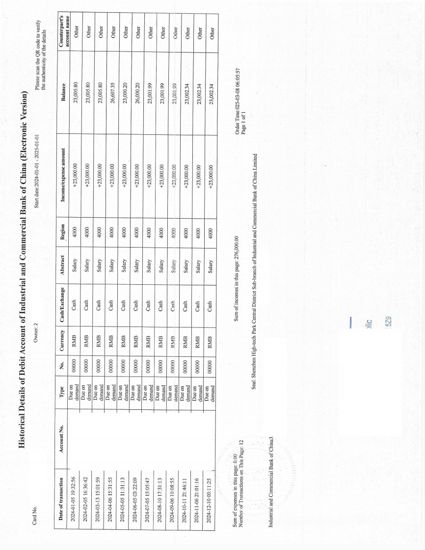 AFFIDAVIT1,1-translator in the City of Toronto,Province of Ontario,make oathand say:1.I am fluent in both Chinese and English.2.I have translated the annexed documents and carefully compared thetranslations from Chinese into English with regard to the followingdocuments:Income Tax Payment Record of the People's Republic of China,Historical Details of Debit Account of ICBC bank3.The said translations are,to the best of my knowledge and ability,thecomplete and correct translations of said documents.SWORN before me at the City of TorontoIn the Regional Municipality of MetropolitanTorontoThis g day of Mrh,202A Notary Public in and for theProvince of Ontario2ublic.3R529