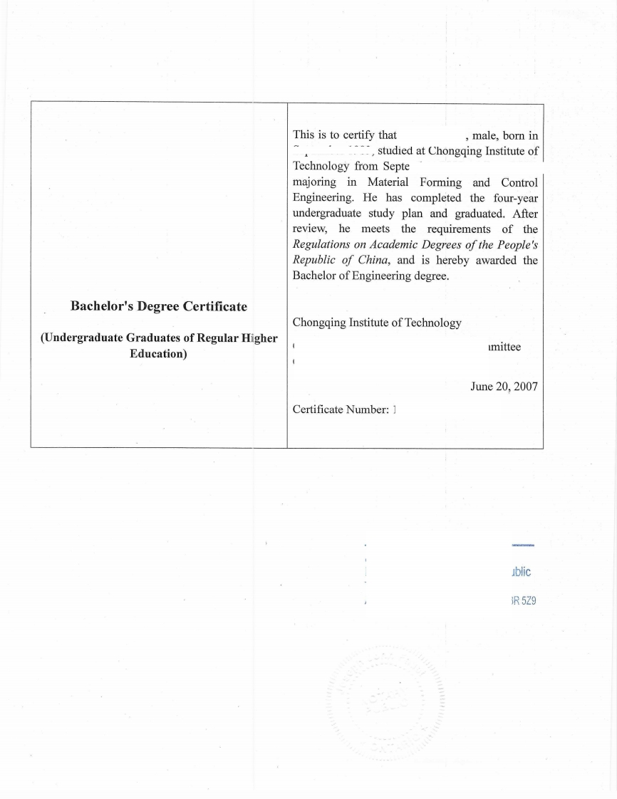 AFFIDAVITL,1say:translator in the City of Toronto,Province of Ontario,make oath and1.I am fluent in both Chinese and English.2.I have translated the annexed document and carefully compared the translationfrom Chinese into English with regard to the following document:Bachelor's Degree Certificate3.The said translation is,to the best of my knowledge and ability,the complete andcorrect translation of said document.SWORN before me at the City of TorontoIn the Regional Municipality of MetropolitanTorontoThisday of Mor,20 26A Notary Public in and for theProvince of OntarioTA75Z9