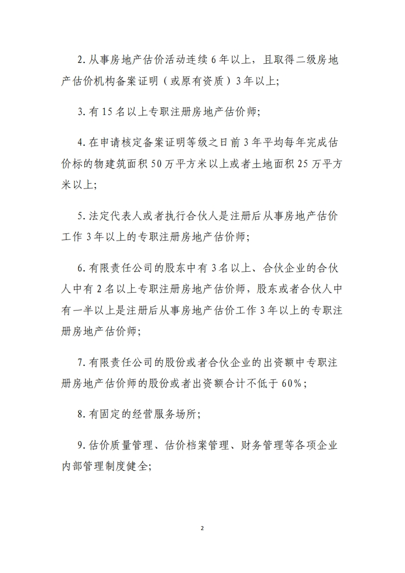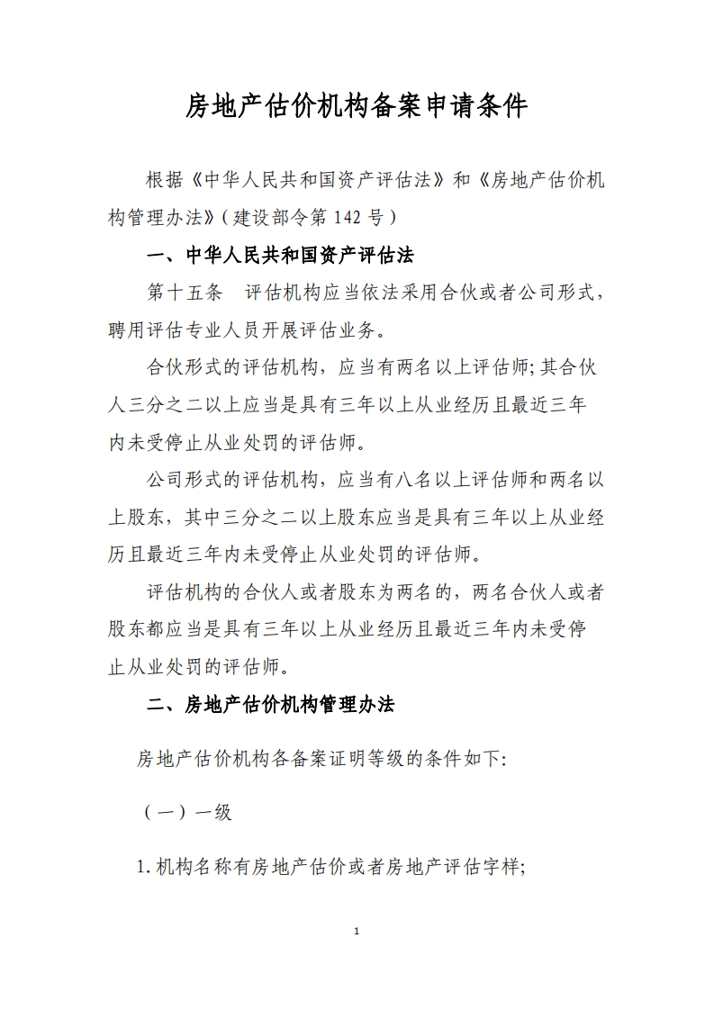 房地产估价机构备案申请条件根据《中华人民共和国资产评估法》和《房地产估价机构管理办法》(建设部令第142号)一、中华人民共和国资产评估法第十五条评估机构应当依法采用合伙或者公司形式,聘用评估专业人员开展评估业务。合伙形式的评估机构,应当有两名以上评估师;其合伙人三分之二以上应当是具有三年以上从业经历且最近三年内未受停止从业处罚的评估师。公司形式的评估机构,应当有八名以上评估师和两名以上股东,其中三分之二以上股东应当是具有三年以上从业经历且最近三年内未受停止从业处罚的评估师。评估机构的合伙人或者股东为两名的,两名合伙人或者股东都应当是具有三年以上从业经历且最近三年内未受停止从业处罚的评估师。二、房地产估价机构管理办法房地产估价机构各备案证明等级的条件如下:(一)一级1.机构名称有房地产估价或者房地产评估字样;