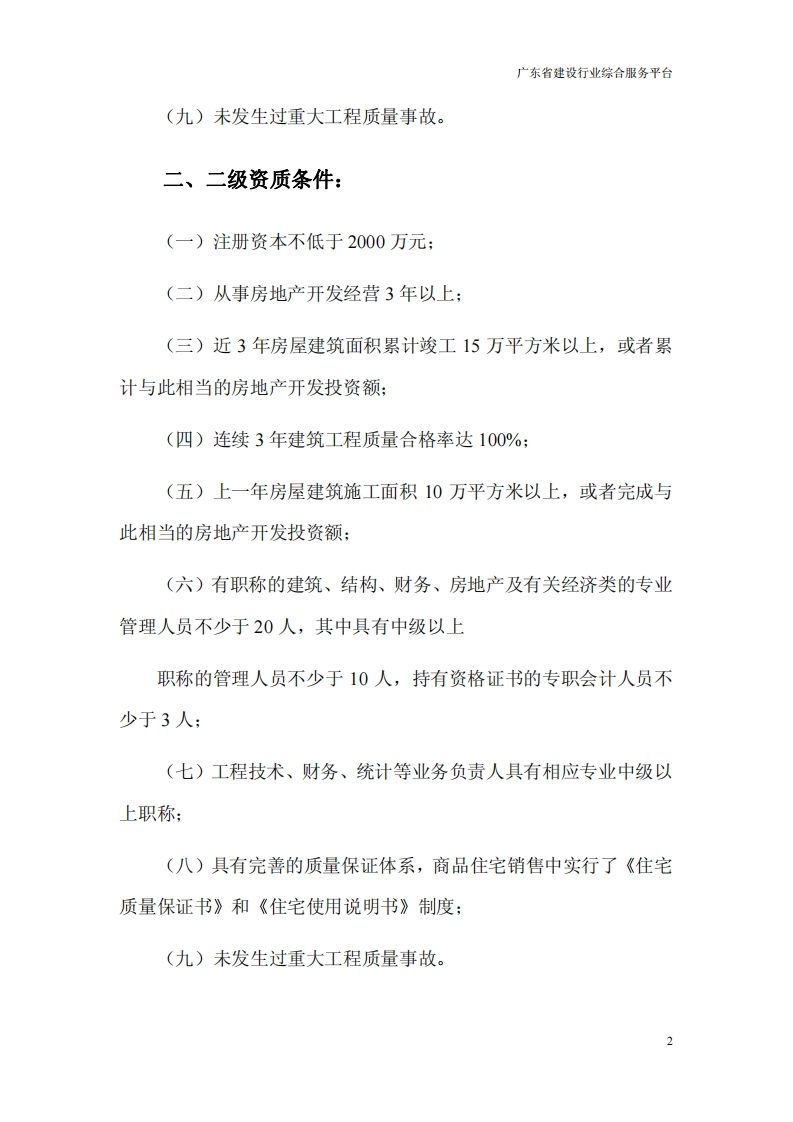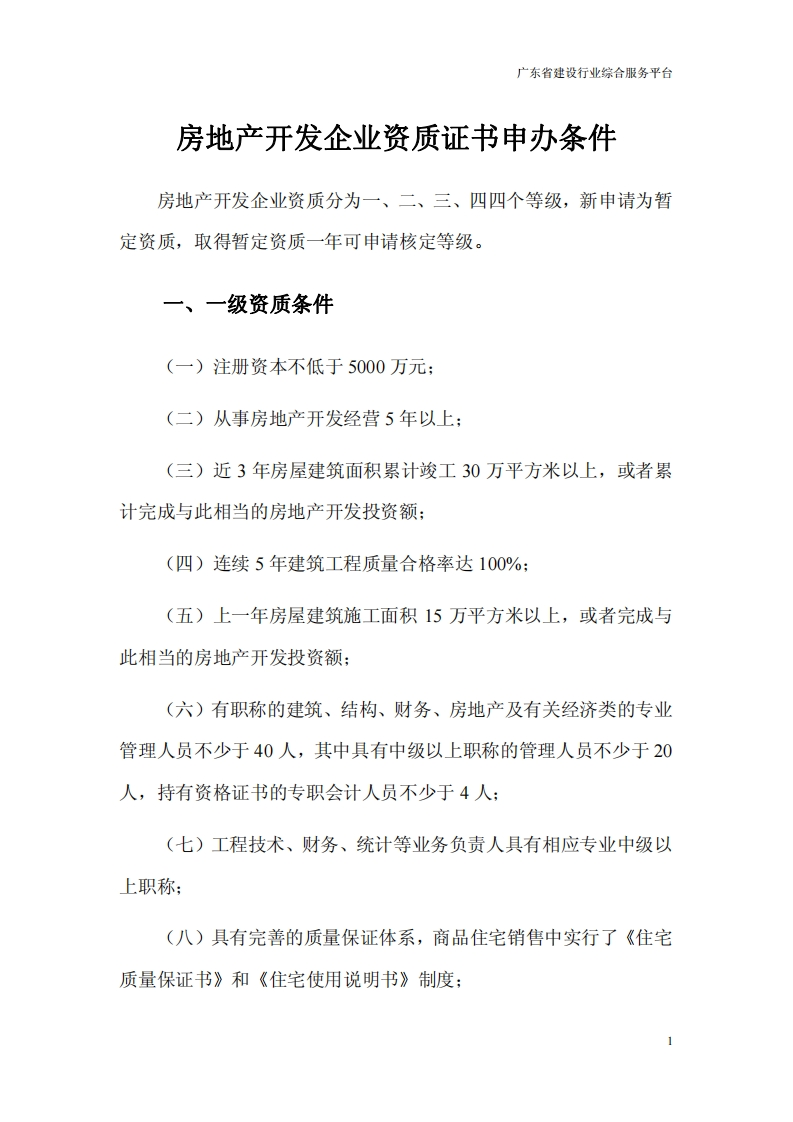 广东省建设行业综合服务平台房地产开发企业资质证书申办条件房地产开发企业资质分为一、二、三、四四个等级,新申请为暂定资质,取得暂定资质一年可申请核定等级。一、一级资质条件(一)注册资本不低于5000万元:(二)从事房地产开发经营5年以上;(三)近3年房屋建筑面积累计竣工30万平方米以上,或者累计完成与此相当的房地产开发投资额:(四)连续5年建筑工程质量合格率达100%:(五)上一年房屋建筑施工面积15万平方米以上,或者完成与此相当的房地产开发投资额:(六)有职称的建筑、结构、财务、房地产及有关经济类的专业管理人员不少于40人,其中具有中级以上职称的管理人员不少于20人,持有资格证书的专职会计人员不少于4人:(七)工程技术、财务、统计等业务负责人具有相应专业中级以上职称;(八)具有完善的质量保证体系,商品住宅销售中实行了《住宅质量保证书》和《住宅使用说明书》制度;1