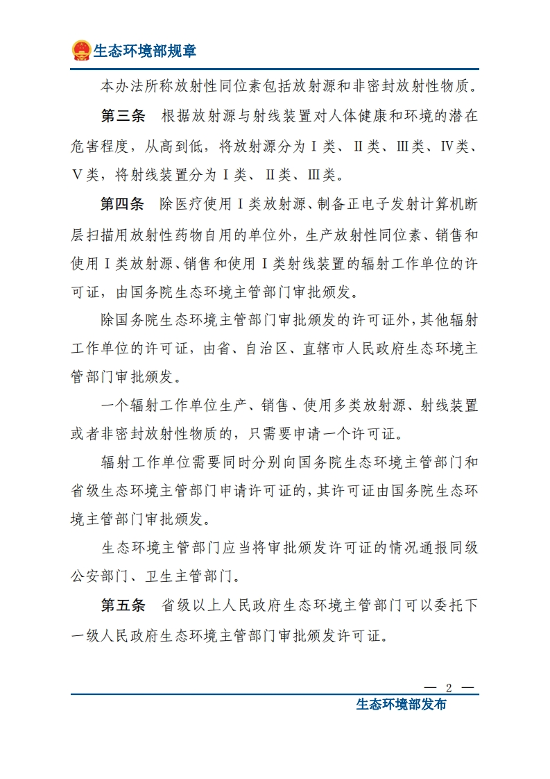 生态环境部规章放射性同位素与射线装置安全许可管理办法(2006年1月18日环境保护总局令第31号公布2008年12月6日环境保护部令第3号第一次修正根据2017年12月20日《环境保护部关于修改部分规章的决定》第二次修正根据2019年8月22日《生态环境部关于废止、修改部分规章的决定》第三次修正根据2021年1月4日《关于废止、修改部分生态环境规章和规范性文件的决定》第四次修正)第一章总则第一条为实施《放射性同位素与射线装置安全和防护条例》规定的辐射安全许可制度,制定本办法。第二条在中华人民共和国境内生产、销售、使用放射性同位素与射线装置的单位(以下简称“辐射工作单位”),应当依照本办法的规定,取得辐射安全许可证(以下简称“许可证”)。进口、转让放射性同位素,进行放射性同位素野外示踪试验,应当依照本办法的规定报批。出口放射性同位素,应当依照本办法的规定办理有关手续。使用放射性同位素的单位将放射性同位素转移到外省、自治区、直辖市使用的,应当依照本办法的规定备案。1生态环境部发布