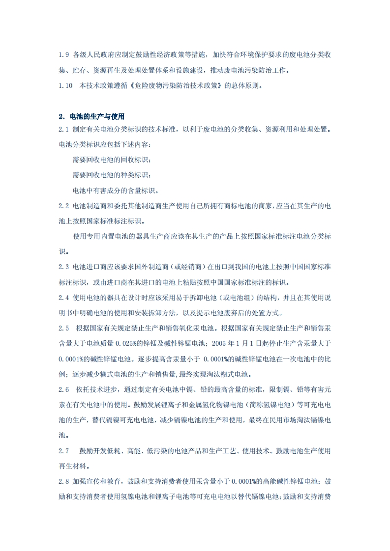 废电池污染防治技术政策2003-10-091.总则1.1为引导废电池环境管理和处理处置、资源再生技术的发展,规范废电池处理处置和资源再生行为,防止环境污染,促进社会和经济的可持续发展,根据《中华人民共和国固体废物污染环境防治法》等有关法律、法规、政策和标准,制定本技术政策。本技术政策随社会经济、技术水平的发展适时修订。1.2本技术政策所称废电池包括下述废物:己经失去使用价值而被废弃的各种一次电池(包括扣式电池)、可充电电池等:已经失去使用价值而被废弃的铅酸蓄电池以及其他蓄电池等:已经失去使用价值而被废弃的各种用电器具的专用电池组及其中的单体电池:上述各种电池在生产、运输、销售过程中产生的不合格产品、报废产品、过期产品等:上述各种电池在生产过程中产生的混合下脚料等混合废料:其他废弃的化学电源。1.3本技术政策适用于废电池的分类、收集、运输、综合利用、贮存和处理处置等全过程污染防治的技术选择,并指导相应设施的规划、立项、选址、设计、施工、运营和管理,引导相关产业的发展。1.4废电池污染控制应该遵循电池产品生命周期分析的基本原理,积极推行清洁生产,实行全过程管理和污染物质总量控制的原则。1.5废电池污染控制的重点是废含汞电池、废镉镍电池、废铅酸蓄电池。逐渐减少以至最终在一次电池生产中不使用汞,安全、高效、低成本收集、回收或安全处置废镉镍电池、废铅酸蓄电池以及其他对环境有害的废电池。1.6废氧化汞电池、废镉镍电池、废铅酸蓄电池属于危险废物,应该按照有关危险废物的管理法规、标准进行管理。1.7鼓励开展废电池污染途径、污染规律和对环境影响小的新型电池开发的科学研究,确定相应的污染防治对策。1.8通过宣传和普及废电池污染防治知识,提高公众环境意识,促进公众对废电池管理及其可能造成的环境危害有正确了解,实现对废电池科学、合理、有效的管理。