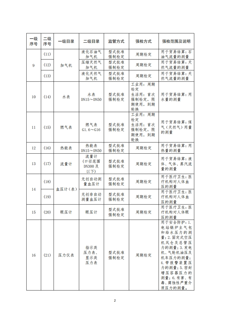 附件实施强制管理的计量器具目录一级二级序号序号一级目录二级目录监管方式强检方式强检范围及说明玻璃体温计只做型式批准和用于医疗卫生:医1(1)体温计体温计型式批准首次强制检强制检定定,失准报废:疗机构对人体温其他体温计周度的测量期检定型式批准用于贸易结算:商2(2)非自动衡器非自动衡器强制检定周期检定品、包裹、行李、粮食等的称重用于安全防护:动态汽车衡车辆超限超载的(3)自动衡器(车辆总重型式批准强制检定周期检定称重计量)用于贸易结算:商品的称重7(4)轨道衡轨道衡型式批准周期检定用于贸易结算:商强制检定品的称重(5)铁路计量罐强制检定周期检定用于贸易结算:液(车)体容积的测量船舶液货计量舱(供油船舶计量舱、船舶污用于贸易结算:原油、成品油及其他5(6)计量罐油舱、污水强制检定周期检定舱、运输船液体或固体容积舶计量舵的测量5000载重吨以下)(7)立式金属罐强制检定周期检定用于贸易结算:液体容积的测量6(8)称重传感器称重传感器型式批准7(9)称重显示器称重显示器型式批准型式批准用于贸易结算:成8(10)加油机燃油加油机强制检定周期检定品油流量的测量