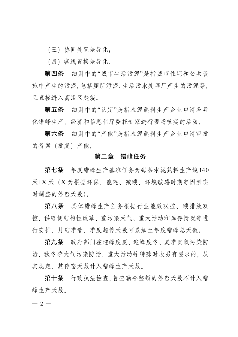 附件四川省水泥行业常态化错峰生产管理实施细则(公开征求意见稿)第一章总则第一条为进一步减少大气污染物排放,持续深入推进水泥行业供给侧结构性改革,促进水泥行业绿色、低碳、高质量发展,按照《关于进一步做好水泥常态化错峰生产的通知》(工信部联原〔2020]201号)、《关于进一步做好川渝地区水泥行业常态化错峰生产工作的通知》(川经信材料[2023]183号)要求,结合我省水泥行业实际,制定本实施细则。第二条本细则适用于四川省内各类所有制水泥熟料生产线。全年生产特种水泥的水泥熟料生产线、以电石渣为唯一钙质原料的水泥熟料生产线、协同处置垃圾的水泥熟料生产线、日均处置危废实物量高于6%(含)的水泥熟料生产线,经报经济和信息化厅和生态环境厅同意后免于错峰生产。第三条细则中的“差异化”是指:(一)超低排放差异化:(二)特种水泥差异化:1