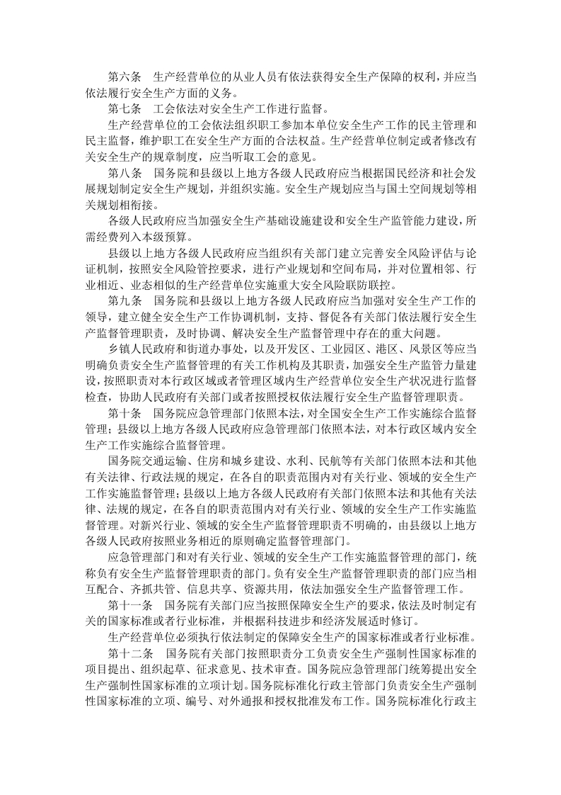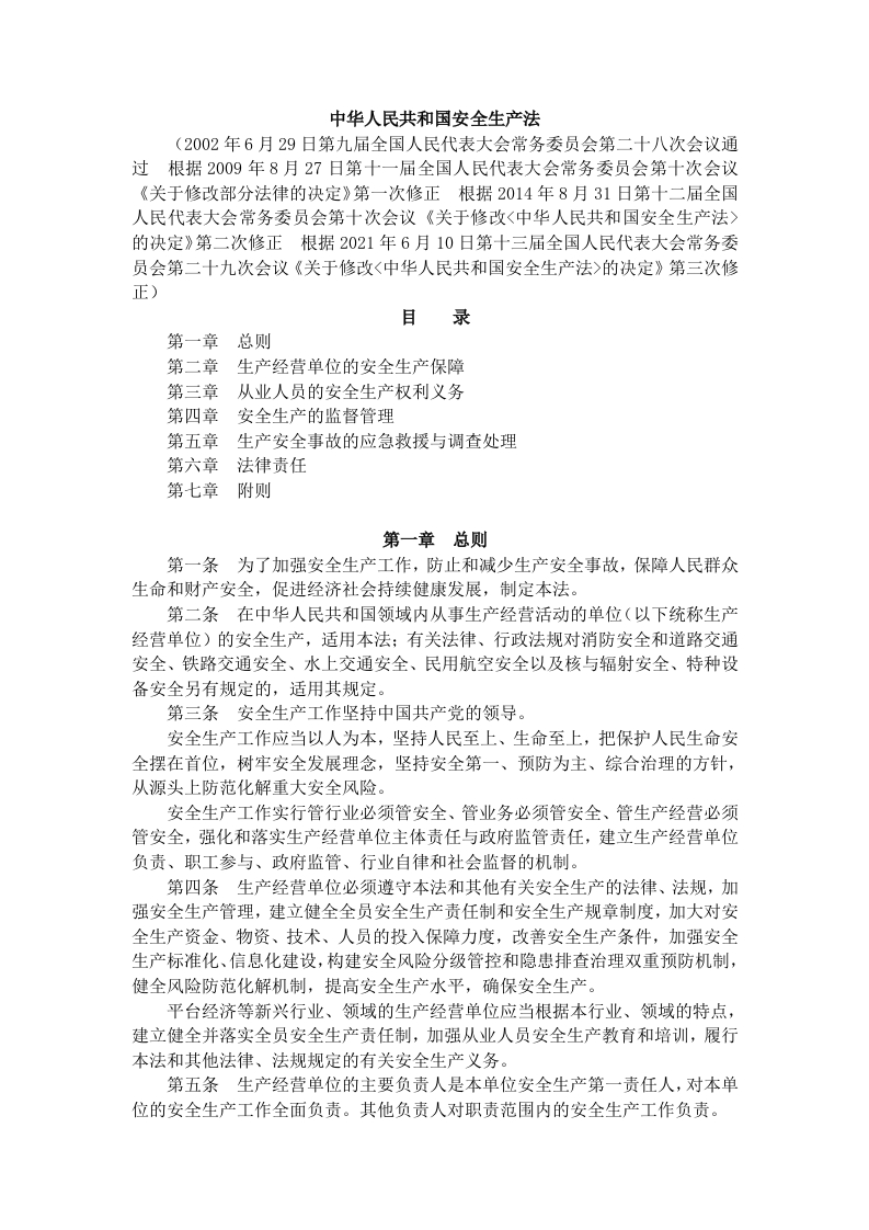 中华人民共和国安全生产法(2002年6月29日第九届全国人民代表大会常务委员会第二十八次会议通过根据2009年8月27日第十一届全国人民代表大会常务委员会第十次会议《关于修改部分法律的决定》第一次修正根据2014年8月31日第十二届全国人民代表大会常务委员会第十次会议《关于修改<中华人民共和国安全生产法>的决定》第二次修正根据2021年6月10日第十三届全国人民代表大会常务委员会第二十九次会议《关于修改<中华人民共和国安全生产法>的决定》第三次修正)目录第一章总则第二章生产经营单位的安全生产保障第三章从业人员的安全生产权利义务第四章安全生产的监督管理第五章生产安全事故的应急救援与调查处理第六章法律责任第七章附则第一章总则第一条为了加强安全生产工作,防止和减少生产安全事故,保障人民群众生命和财产安全,促进经济社会持续健康发展,制定本法。第二条在中华人民共和国领域内从事生产经营活动的单位(以下统称生产经营单位)的安全生产,适用本法:有关法律、行政法规对消防安全和道路交通安全、铁路交通安全、水上交通安全、民用航空安全以及核与辐射安全、特种设备安全另有规定的,适用其规定。第三条安全生产工作坚持中国共产党的领导。安全生产工作应当以人为本,坚持人民至上、生命至上,把保护人民生命安全摆在首位,树牢安全发展理念,坚持安全第一、预防为主、综合治理的方针,从源头上防范化解重大安全风险。安全生产工作实行管行业必须管安全、管业务必须管安全、管生产经营必须管安全,强化和落实生产经营单位主体责任与政府监管责任,建立生产经营单位负责、职工参与、政府监管、行业自律和社会监督的机制。第四条生产经营单位必须遵守本法和其他有关安全生产的法律、法规,加强安全生产管理,建立健全全员安全生产责任制和安全生产规章制度,加大对安全生产资金、物资、技术、人员的投入保障力度,改善安全生产条件,加强安全生产标准化、信息化建设,构建安全风险分级管控和隐患排查治理双重预防机制,健全风险防范化解机制,提高安全生产水平,确保安全生产。平台经济等新兴行业、领域的生产经营单位应当根据本行业、领域的特点,建立健全并落实全员安全生产责任制,加强从业人员安全生产教育和培训,履行本法和其他法律、法规规定的有关安全生产义务。第五条生产经营单位的主要负责人是本单位安全生产第一责任人,对本单位的安全生产工作全面负责。其他负责人对职责范围内的安全生产工作负责。