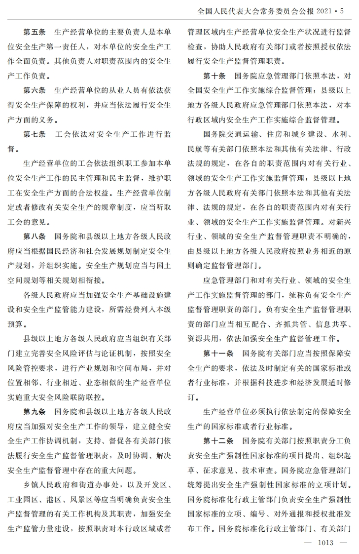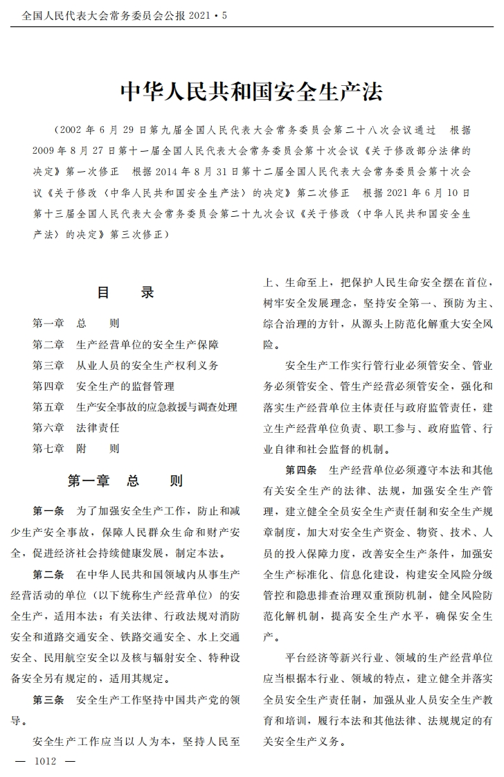 全国人民代表大会常务委员会公报2021·5中华人民共和国安全生产法(2002年6月29日第九届全国人民代表大会常务委员会第二十八次会议通过根据2009年8月27日第十一届全国人民代表大会常务委员会第十次会议《关于修改部分法律的决定》第一次修正根据2014年8月31日第十二届全国人民代表大会常务委员会第十次会议《关于修改〈中华人民共和国安全生产法〉的决定》第二次修正根据2021年6月10日第十三届全国人民代表大会常务委员会第二十九次会议《关于修改〈中华人民共和国安全生产法〉的决定》第三次修正)上、生命至上,把保护人民生命安全摆在首位,目录树牢安全发展理念,坚持安全第一、预防为主、第一章总则综合治理的方针,从源头上防范化解重大安全风第二章生产经营单位的安全生产保障险。第三章从业人员的安全生产权利义务安全生产工作实行管行业必须管安全、管业第四章安全生产的监督管理务必须管安全、管生产经营必须管安全,强化和第五章生产安全事故的应急救援与调查处理落实生产经营单位主体责任与政府监管责任,建第六章法律责任立生产经营单位负责、职工参与、政府监管、行第七章附则业自律和社会监督的机制。第四条生产经营单位必须遵守本法和其他第一章总则有关安全生产的法律、法规,加强安全生产管第一条为了加强安全生产工作,防止和减理,建立健全全员安全生产责任制和安全生产规少生产安全事故,保障人民群众生命和财产安章制度,加大对安全生产资金、物资、技术、人全,促进经济社会持续健康发展,制定本法。员的投入保障力度,改善安全生产条件,加强安第二条在中华人民共和国领域内从事生产全生产标准化、信息化建设,构建安全风险分级经营活动的单位(以下统称生产经营单位)的安管控和隐患排查治理双重预防机制,健全风险防全生产,适用本法;有关法律、行政法规对消防范化解机制,提高安全生产水平,确保安全生安全和道路交通安全、铁路交通安全、水上交通产。安全、民用航空安全以及核与辐射安全、特种设平台经济等新兴行业、领域的生产经营单位备安全另有规定的,适用其规定。应当根据本行业、领域的特点,建立健全并落实第三条安全生产工作坚持中国共产党的领全员安全生产责任制,加强从业人员安全生产教导。育和培训,履行本法和其他法律、法规规定的有安全生产工作应当以人为本,坚持人民至关安全生产义务。-1012