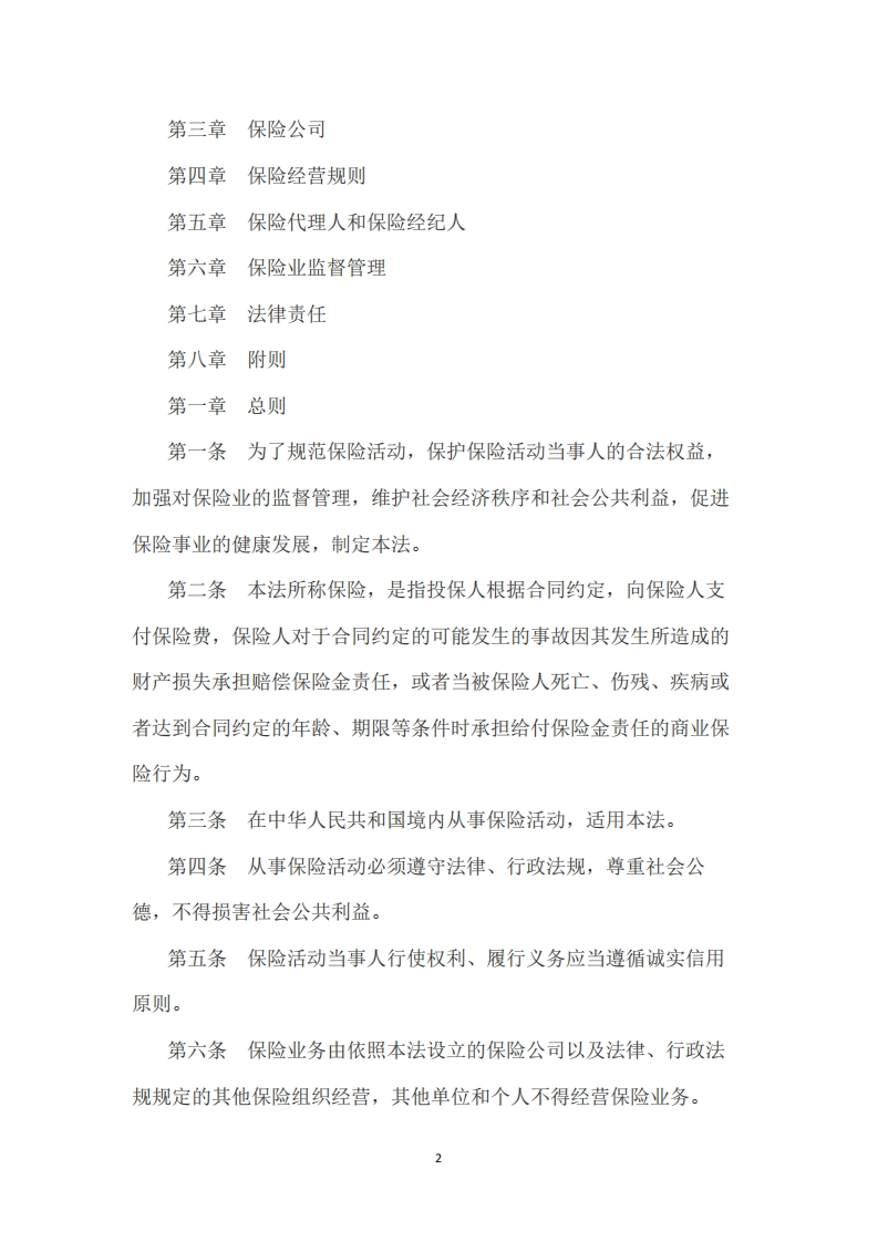 中华人民共和国保险法(2015年修订)发文单位:全国人民代表大会常务委员会文号:中华人民共和国主席令第26号效力范围:全文有效发文日期:2015-04-24生效日期:2015-04-24(1995年6月30日第八届全国人民代表大会常务委员会第十四次会议通过,根据2002年10月28日第九届全国人民代表大会常务委员会第三十次会议《关于修改<中华人民共和国保险法>的决定》第一次修正,2009年2月28日第十一届全国人民代表大会常务委员会第七次会议修订,根据2014年8月31日第十二届全国人民代表大会常务委员会第十次会议《关于修改<中华人民共和国保险法>等五部法律的决定》第二次修正,根据2015年4月24日第十二届全国人民代表大会常务委员会第十四次会议《关于修改<中华人民共和国计量法>等五部法律的决定》第三次修正)目录第一章总则第二章保险合同第一节一般规定第二节人身保险合同第三节财产保险合同1
