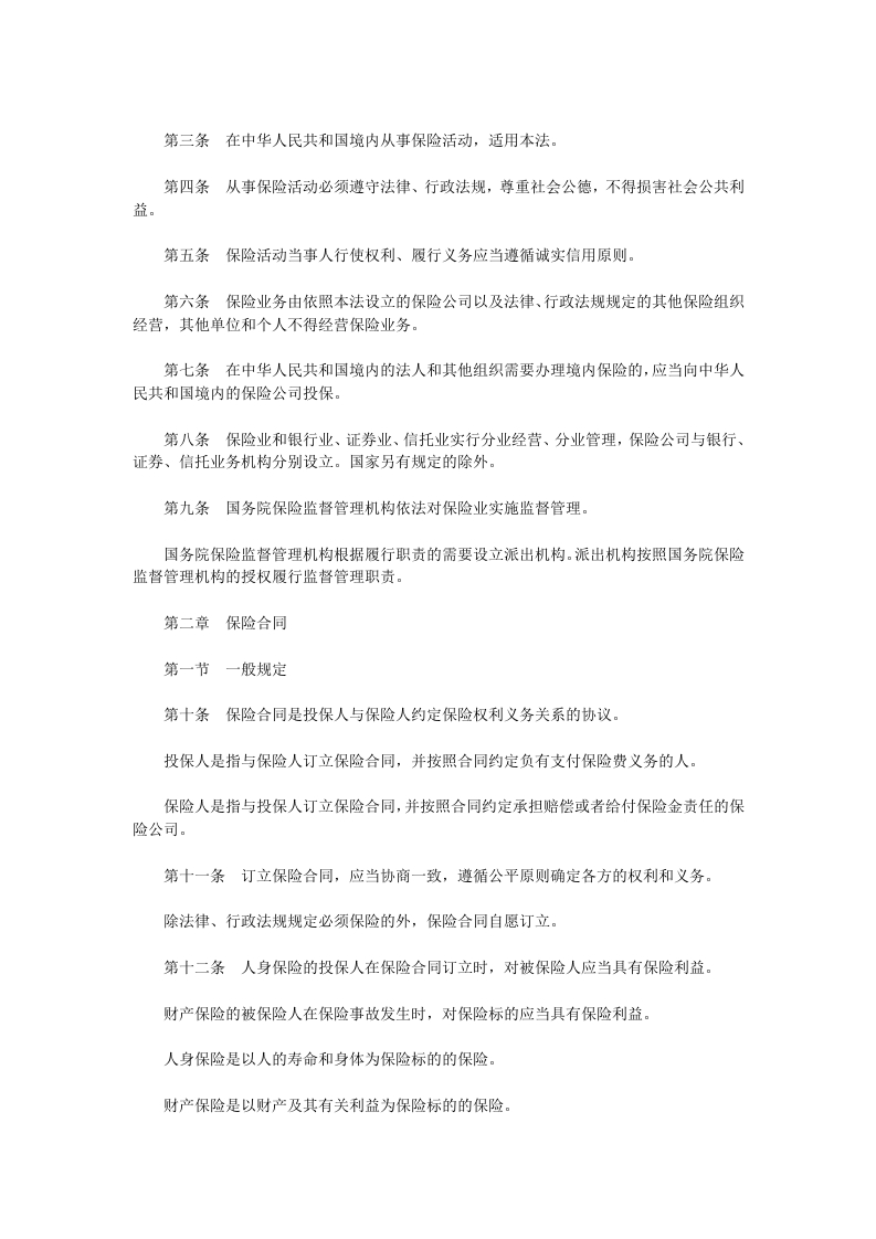 中华人民共和国保险法(1995年6月30日第八届全国人民代表大会常务委员会第十四次会议通过根据2002年10月28日第九届全国人民代表大会常务委员会第三十次会议《关于修改(中华人民共和国保险法〉的决定》第一次修正2009年2月28日第十一届全国人民代表大会常务委员会第七次会议修订根据2014年8月31日第十二届全国人民代表大会常务委员会第十次会议《关于修改(中华人民共和国保险法》等五部法律的决定》第二次修正根据2015年4月24日第十二届全国人民代表大会常务委员会第十四次会议《关于修改〈中华人民共和国计量法》等五部法律的决定》第三次修正)目录第一章总则第二章保险合同第一节一般规定第二节人身保险合同第三节财产保险合同第三章保险公司第四章保险经营规则第五章保险代理人和保险经纪人第六章保险业监督管理第七章法律责任第八章附则第一章总则第一条为了规范保险活动,保护保险活动当事人的合法权益,加强对保险业的监督管理,维护社会经济秩序和社会公共利益,促进保险事业的健康发展,制定本法。第二条本法所称保险,是指投保人根据合同约定,向保险人支付保险费,保险人对于合同约定的可能发生的事故因其发生所造成的财产损失承担赔偿保险金责任,或者当被保险人死亡、伤残、疾病或者达到合同约定的年龄、期限等条件时承担给付保险金责任的商业保险行为。