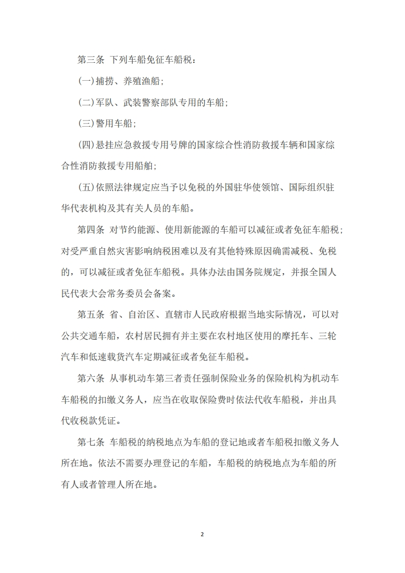 中华人民共和国车船税法(2019年)发文单位:全国人民代表大会常务委员会文号:中华人民共和国主席令第29号效力范围:全文有效发文日期:2019-04-23生效日期:2019-04-23(根据2019年4月23日中华人民共和国第十三届全国人民代表大会常务委员会第十次会议通过,2019年4月23日由中华人民共和国主席令第29号公布,自公布之日起施行的《全国人民代表大会常务委员会关于修改〈中华人民共和国建筑法〉等八部法律的决定》修订)第一条在中华人民共和国境内属于本法所附《车船税税目税额表》规定的车辆、船舶(以下简称车船)的所有人或者管理人,为车船税的纳税人,应当依照本法缴纳车船税。第二条车船的适用税额依照本法所附《车船税税目税额表》执行。车辆的具体适用税额由省、自治区、直辖市人民政府依照本法所附《车船税税目税额表》规定的税额幅度和国务院的规定确定。船舶的具体适用税额由国务院在本法所附《车船税税目税额表》规定的税额幅度内确定。1