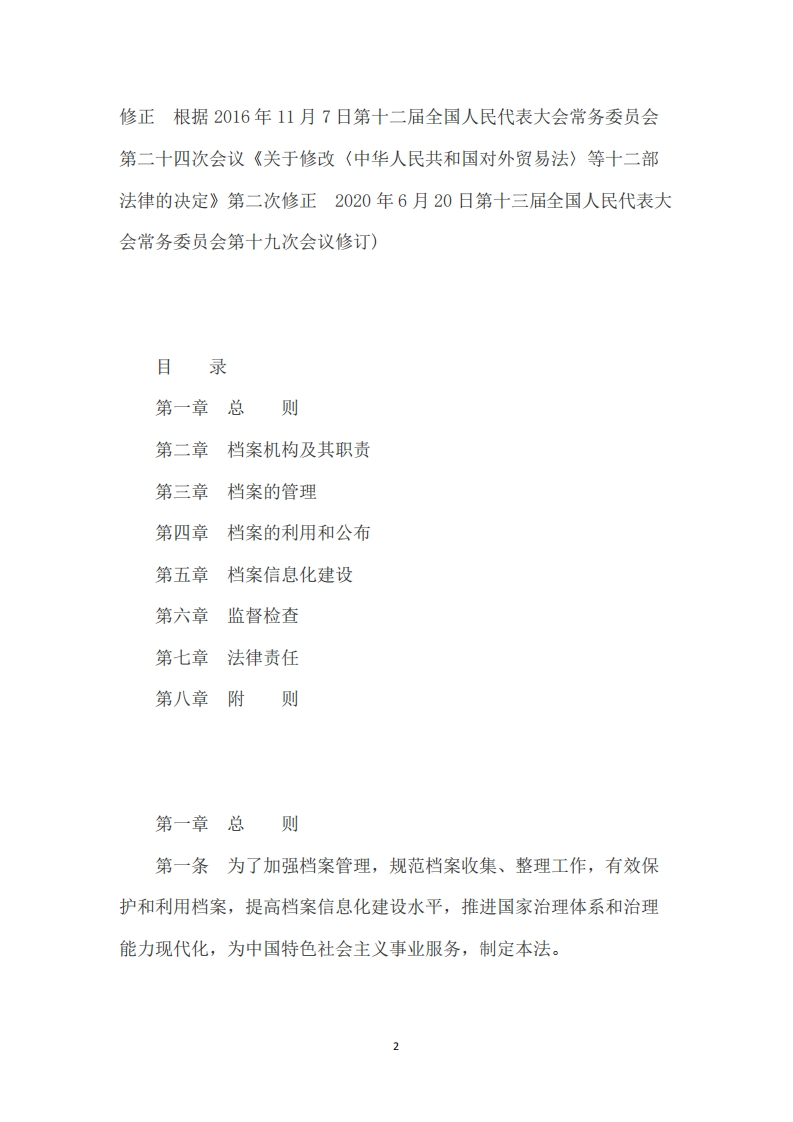 中华人民共和国档案法(2020年修订)发文单位:全国人民代表大会常务委员会文号:中华人民共和国主席令第四十七号效力范围:全文有效发文日期:2020-06-20生效日期:2021-01-01《中华人民共和国档案法》已由中华人民共和国第十三届全国人民代表大会常务委员会第十九次会议于2020年6月20日修订通过,现予公布,自2021年1月1日起施行。中华人民共和国主席习近平2020年6月20日中华人民共和国档案法(1987年9月5日第六届全国人民代表大会常务委员会第二十二次会议通过根据1996年7月5日第八届全国人民代表大会常务委员会第二十次会议《关于修改〈中华人民共和国档案法〉的决定》第一次1