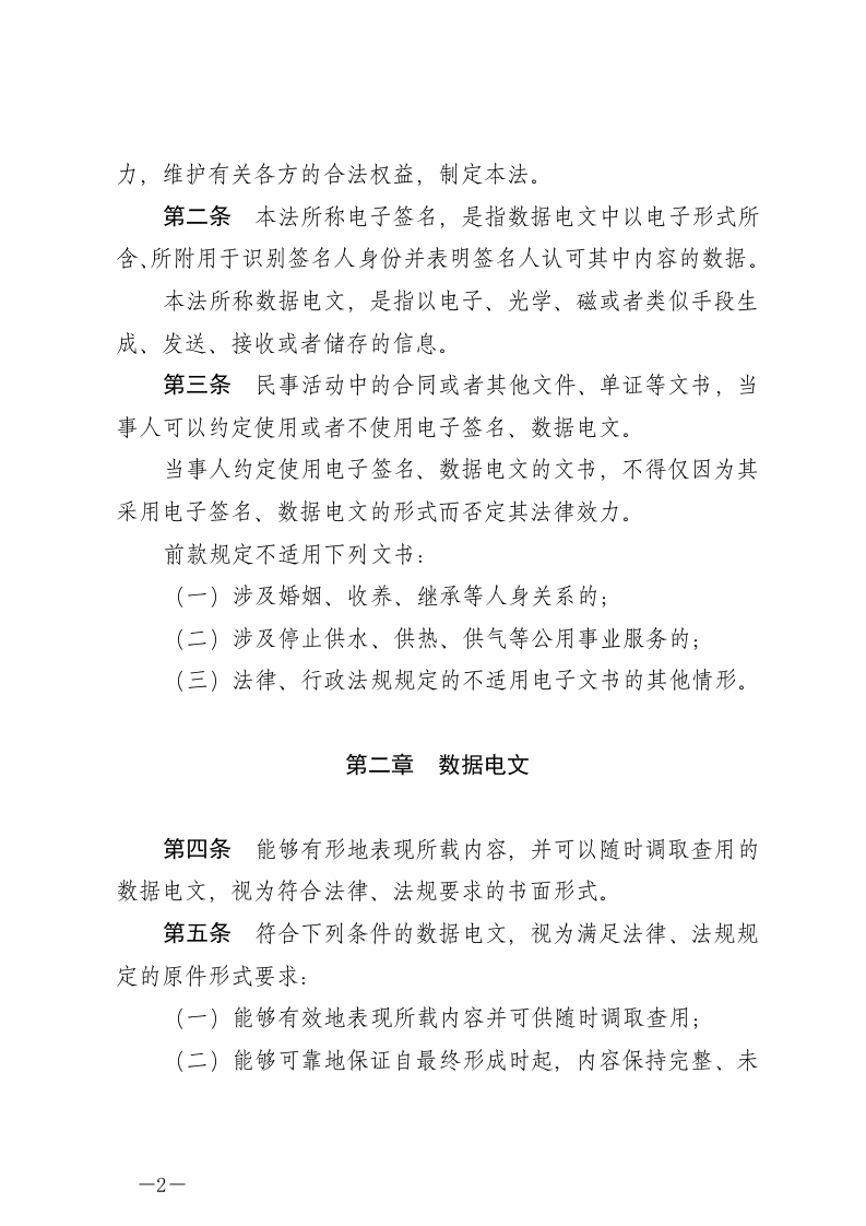 中华人民共和国电子签名法(2004年8月28日第十届全国人民代表大会常务委员会第十一次会议通过根据2015年4月24日第十二届全国人民代表大会常务委员会第十四次会议《关于修改<中华人民共和国电力法>等六部法律的决定》第一次修正根据2019年4月23日第十三届全国人民代表大会常务委员会第十次会议《关于修改<中华人民共和国建筑法>等八部法律的决定》第二次修正)目录第一章总则第二章数据电文第三章电子签名与认证第四章法律责任第五章附则第一章总则第一条为了规范电子签名行为,确立电子签名的法律效-1一