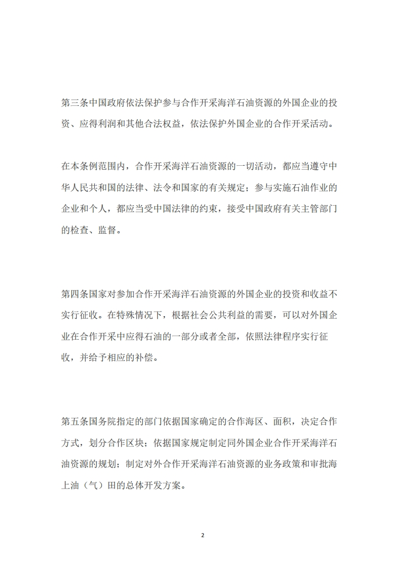 中华人民共和国对外合作开采海洋石油资源条例(2013修订)发文单位:国务院文号:中华人民共和国国务院令第638号效力范围:全文有效发文日期:2013-07-18生效日期:2013-07-18第一章总则第一条为促进国民经济的发展,扩大国际经济技术合作,在维护国家主权和经济利益的前提下允许外国企业参与合作开采中华人民共和国海洋石油资源,特制定本条例。第二条中华人民共和国的内海、领海、大陆架以及其他属于中华人民共和国海洋资源管辖海域的石油资源,都属于中华人民共和国国家所有。在前款海域内,为开采石油而设置的建筑物、构筑物、作业船舶,以及相应的陆岸油(气)集输终端和基地,都受中华人民共和国管辖。1