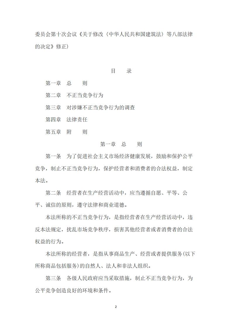 中华人民共和国反不正当竞争法(2019年)发文单位:全国人民代表大会常务委员会文号:中华人民共和国主席令第29号效力范围:全文有效发文日期:2019-04-23生效日期:2019-04-23《全国人民代表大会常务委员会关于修改<中华人民共和国建筑法>等八部法律的决定》已由中华人民共和国第十三届全国人民代表大会常务委员会第十次会议于2019年4月23日通过,现予公布,《中华人民共和国商标法》的修改条款自2019年11月1日起施行,其他法律的修改条款自本决定公布之日起施行。中华人民共和国主席习近平2019年4月23日中华人民共和国反不正当竞争法(1993年9月2日第八届全国人民代表大会常务委员会第三次会议通过2017年11月4日第十二届全国人民代表大会常务委员会第三十次会议修订根据2019年4月23日第十三届全国人民代表大会常务1