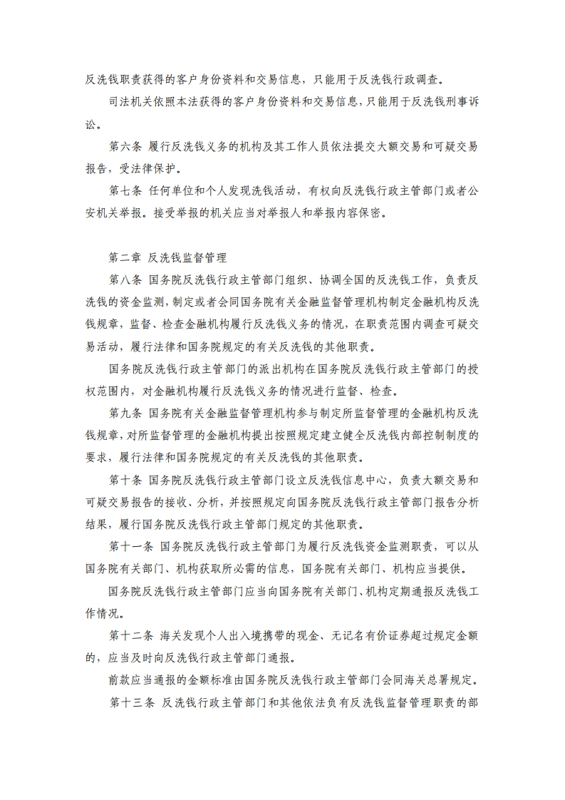 中华人民共和国反洗钱法目录第一章总则第二章反洗钱监督管理第三章金融机构反洗钱义务第四章反洗钱调查第五章反洗钱国际合作第六章法律责任第七章附则第一章总则第一条为了预防洗钱活动,维护金融秩序,遏制洗钱犯罪及相关犯罪,制定本法。第二条本法所称反洗钱,是指为了预防通过各种方式掩饰、隐瞒毒品犯罪、黑社会性质的组织犯罪、恐怖活动犯罪、走私犯罪、贪污贿赂犯罪、破坏金融管理秩序犯罪、金融诈骗犯罪等犯罪所得及其收益的来源和性质的洗钱活动,依照本法规定采取相关措施的行为。第三条在中华人民共和国境内设立的金融机构和按照规定应当履行反洗钱义务的特定非金融机构,应当依法采取预防、监控措施,建立健全客户身份识别制度、客户身份资料和交易记录保存制度、大额交易和可疑交易报告制度,履行反洗钱义务。第四条国务院反洗钱行政主管部门负责全国的反洗钱监督管理工作。国务院有关部门、机构在各自的职责范围内履行反洗钱监督管理职责。国务院反洗钱行政主管部门、国务院有关部门、机构和司法机关在反洗钱工作中应当相互配合。第五条对依法履行反洗钱职责或者义务获得的客户身份资料和交易信息,应当予以保密;非依法律规定,不得向任何单位和个人提供。反洗钱行政主管部门和其他依法负有反洗钱监督管理职责的部门、机构履行