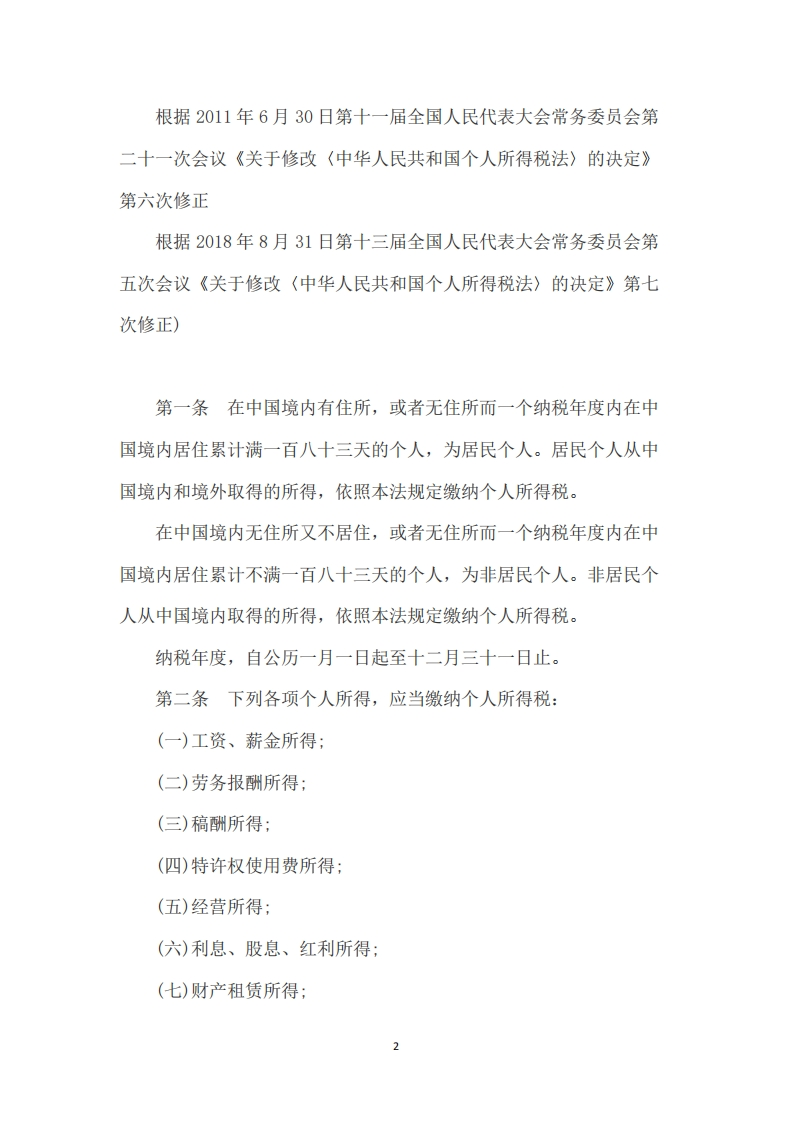 中华人民共和国个人所得税法(2018年)发文单位:第十三届全国人民代表大会常务委员会文号:中华人民共和国主席令第9号效力范围:全文有效发文日期:2018-08-31生效日期:2019-01-01(1980年9月10日第五届全国人民代表大会第三次会议通过根据1993年10月31日第八届全国人民代表大会常务委员会第四次会议《关于修改〈中华人民共和国个人所得税法〉的决定》第一次修正根据1999年8月30日第九届全国人民代表大会常务委员会第十一次会议《关于修改〈中华人民共和国个人所得税法〉的决定》第二次修正根据2005年10月27日第十届全国人民代表大会常务委员会第十八次会议《关于修改(中华人民共和国个人所得税法〉的决定》第三次修正根据2007年6月29日第十届全国人民代表大会常务委员会第二十八次会议《关于修改〈中华人民共和国个人所得税法〉的决定》第四次修正根据2007年12月29日第十届全国人民代表大会常务委员会第三十一次会议《关于修改〈中华人民共和国个人所得税法〉的决定》第五次修正