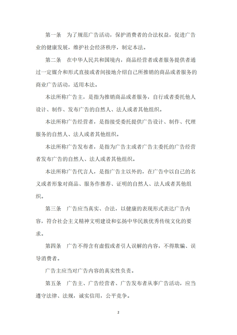 中华人民共和国广告法(2021)发文单位:全国人民代表大会常务委员会文号:中华人民共和国主席令第81号效力范围:全文有效发文日期:2021-04-29生效日期:2021-04-29(1994年10月27日第八届全国人民代表大会常务委员会第十次会议通过,2015年4月24日第十二届全国人民代表大会常务委员会第十四次会议修订,根据2018年10月26日第十三届全国人民代表大会常务委员会第六次会议《关于修改〈中华人民共和国野生动物保护法〉等十五部法律的决定》第一次修正,根据2021年4月29日第十三届全国人民代表大会常务委员会第二十八次会议《关于修改〈中华人民共和国道路交通安全法〉等八部法律的决定》第二次修正)目录第一章总则第二章广告内容准则第三章广告行为规范第四章监督管理第五章法律责任第六章附则第一章总则1