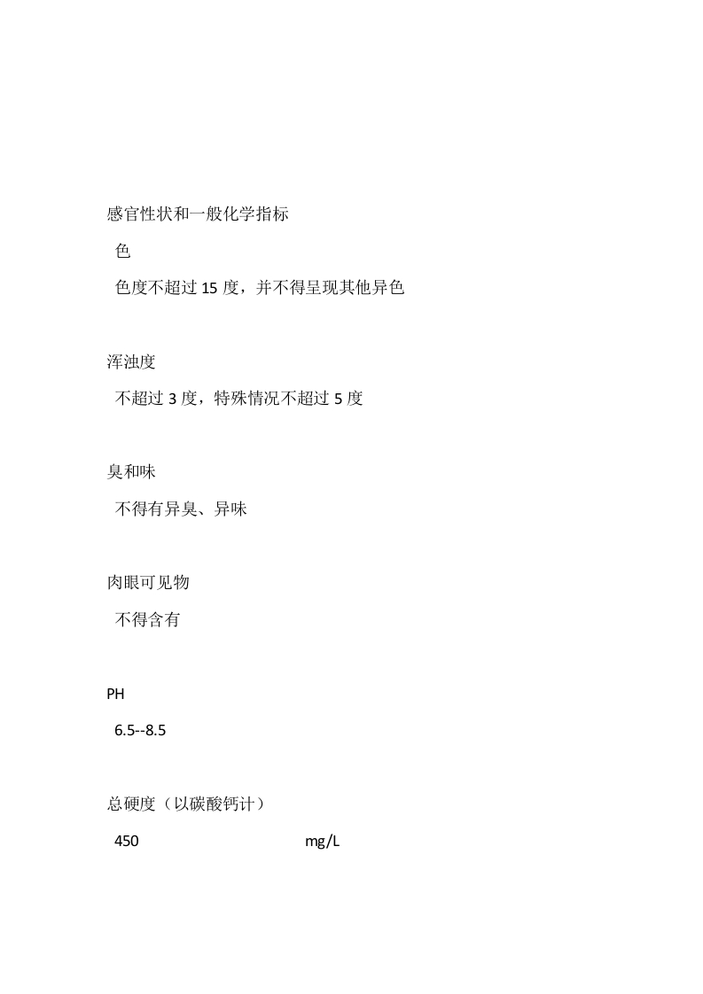 中华人民共和国国家标准生活饮用水卫生标准化一、总则1、为贯彻“预防为主”的方针,向居民供应符合卫生要求的生活饮用水,保障人民的身体健康,特制订本标准。2、本标准由供水单位和规划设计等有关单位负责执行。各级卫生防疫站、环境卫生监测站负责监督和检查执行情况。新建、扩建、改建集中式给水时,供水单位的主管部门必须会同卫生、环境保护、规划、城建和水利共同研究用水规划,确定水源选择、水源防护和工程设计方案,认真审查、设计,做好竣工验收,经卫生防疫站同意后,方可投入使用。分散式给水的水源选择、水质鉴定、卫生防疫和经常管理,由供水所在地的乡、镇政府委派当地有关单位研究决定。各级公安、规划、卫生、环境保护必须协同供水单位,按标准规定的防护地带要求,做好水源保护工作,防止污染。3、本标准适用于城乡供生活饮用的集中式给水(包括各单位自备的生活用水)和分散式给水。二、水质标准和卫生要求1、生活饮用水水质,不应超过下表所规定的限量。生活饮用水水质标准