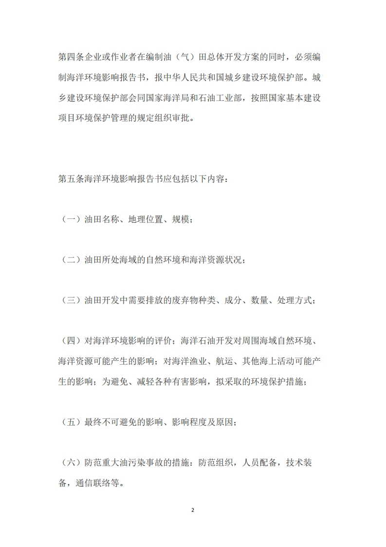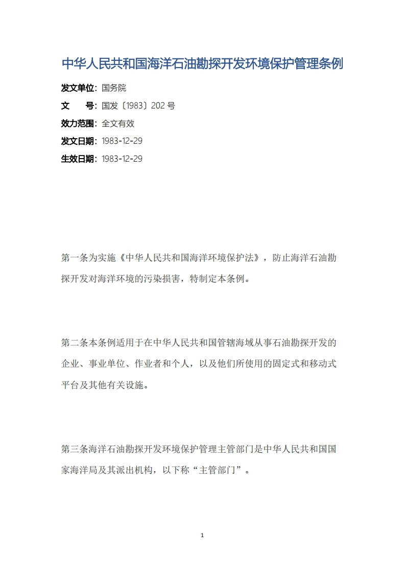中华人民共和国海洋石油勘探开发环境保护管理条例发文单位:国务院文号:国发〔1983)202号效力范围:全文有效发文日期:1983-12-29生效日期:1983-12-29第一条为实施《中华人民共和国海洋环境保护法》,防止海洋石油勘探开发对海洋环境的污染损害,特制定本条例。第二条本条例适用于在中华人民共和国管辖海域从事石油勘探开发的企业、事业单位、作业者和个人,以及他们所使用的固定式和移动式平台及其他有关设施。第三条海洋石油勘探开发环境保护管理主管部门是中华人民共和国国家海洋局及其派出机构,以下称“主管部门”。1