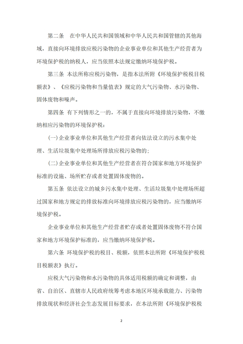 中华人民共和国环境保护税法(2018年10月修订)发文单位:全国人民代表大会常务委员会文号:中华人民共和国主席令第16号效力范围:全文有效发文日期:2018-10-26生效日期:2018-10-26(根据2018年10月26日第十三届全国人民代表大会常务委员会第六次会议通过,2018年10月26日中华人民共和国主席令第16号公布,自公布之日起施行的《全国人民代表大会常务委员会关于修改(中华人民共和国野生动物保护法〉等十五部法律的决定》修订)目录第一章总则第二章计税依据和应纳税额第三章税收减免第四章征收管理第五章附则第一章总则第一条为了保护和改善环境,减少污染物排放,推进生态文明建设,制定本法。1