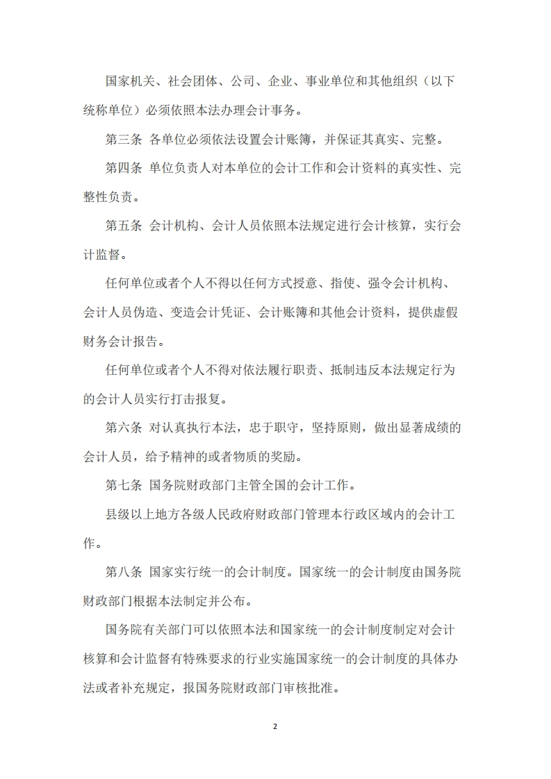 中华人民共和国会计法(2024年)发文单位:全国人民代表大会常务委员会文号:(无文号)效力范围:全文有效发文日期:2024-06-28生效日期:2024-07-01(1985年1月21日第六届全国人民代表大会常务委员会第九次会议通过根据1993年12月29日第八届全国人民代表大会常务委员会第五次会议《关于修改<中华人民共和国会计法>的决定》第一次修正1999年10月31日第九届全国人民代表大会常务委员会第十二次会议修订根据2017年11月4日第十二届全国人民代表大会常务委员会第三十次会议《关于修改<中华人民共和国会计法>等十一部法律的决定》第二次修正根据2024年6月28日第十四届全国人民代表大会常务委员会第十次会议《关于修改<中华人民共和国会计法>的决定》第三次修正)第一章总则第一条为了规范会计行为,保证会计资料真实、完整,加强经济管理和财务管理,提高经济效益,维护社会主义市场经济秩序,制定本法。第二条会计工作应当贯彻落实党和国家路线方针政策、决策部署,维护社会公共利益,为国民经济和社会发展服务。