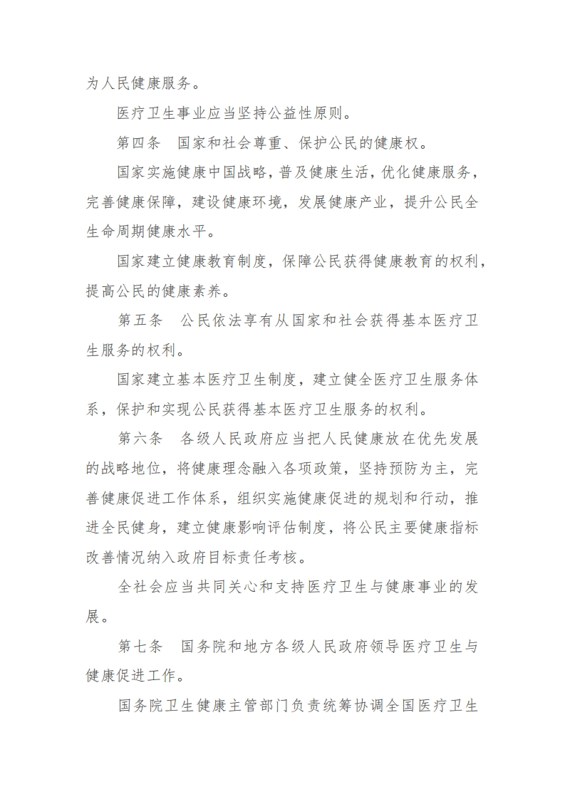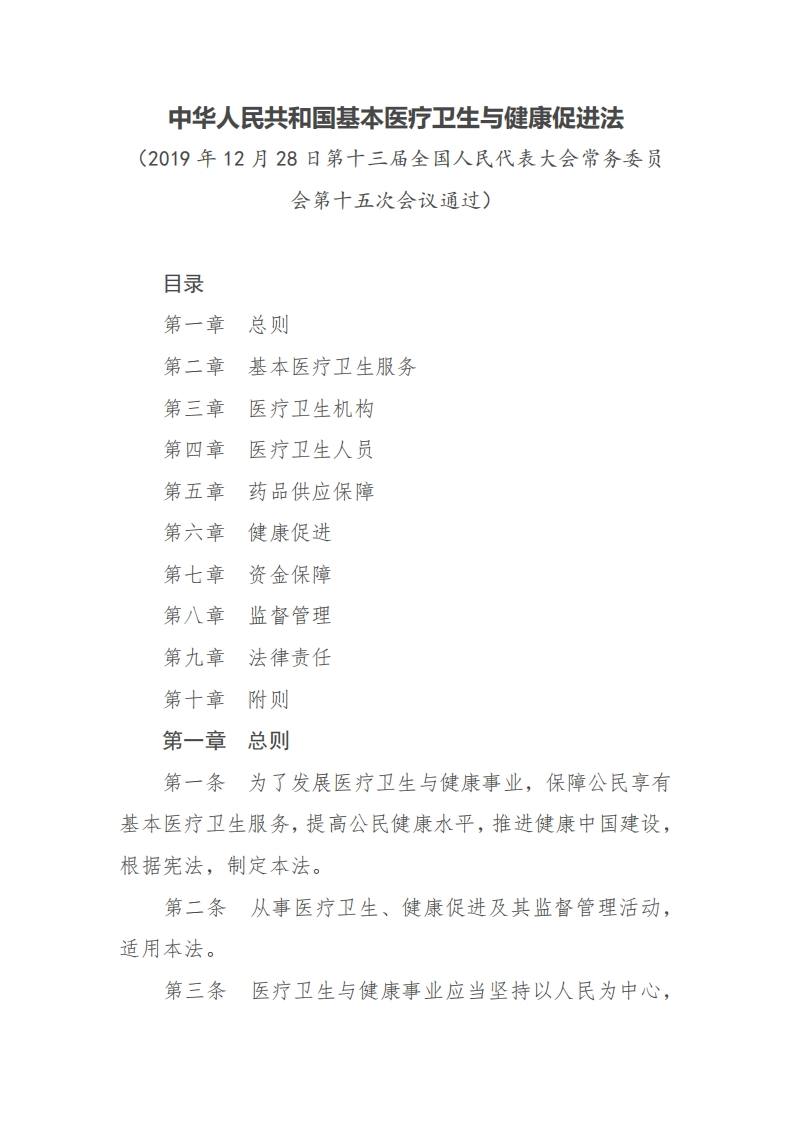 中华人民共和国基本医疗卫生与健康促进法(2019年12月28日第十三届全国人民代表大会常务委员会第十五次会议通过)目录第一章总则第二章基本医疗卫生服务第三章医疗卫生机构第四章医疗卫生人员第五章药品供应保障第六章健康促进第七章资金保障第八章监督管理第九章法律责任第十章附则第一章总则第一条为了发展医疗卫生与健康事业,保障公民享有基本医疗卫生服务,提高公民健康水平,推进健康中国建设,根据宪法,制定本法。第二条从事医疗卫生、健康促进及其监督管理活动,适用本法。第三条医疗卫生与健康事业应当坚持以人民为中心,
