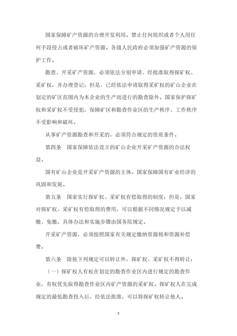 中华人民共和国矿产资源法(2009年)发文单位:全国人民代表大会常务委员会文号:中华人民共和国主席令第18号效力范围:全文有效发文日期:2009-08-27生效日期:2009-08-27(1986年3月19日第六届全国人民代表大会常务委员会第十五次会议通过,根据1996年8月29日第八届全国人民代表大会常务委员会第二十一次会议《关于修改<中华人民共和国矿产资源法>的决定》第一次修正,根据2009年8月27日第十一届全国人民代表大会常务委员会第十次会议《关于修改部分法律的决定》第二次修正)第一章总则第一条为了发展矿业,加强矿产资源的勘查、开发利用和保护工作,保障社会主义现代化建设的当前和长远的需要,根据中华人民共和国宪法,特制定本法。第二条在中华人民共和国领域及管辖海域勘查、开采矿产资源,必须遵守本法。第三条矿产资源属于国家所有,由国务院行使国家对矿产资源的所有权。地表或者地下的矿产资源的国家所有权,不因其所依附的土地的所有权或者使用权的不同而改变。