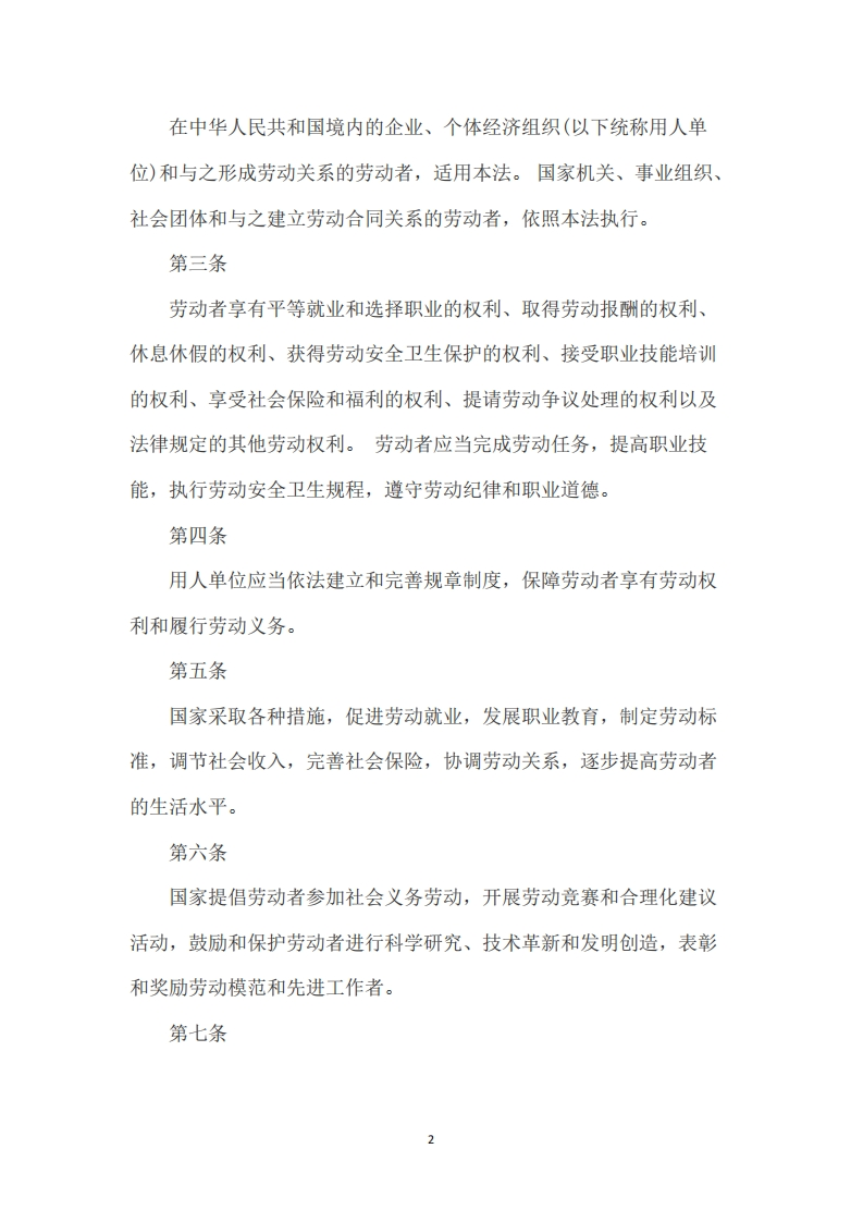 中华人民共和国劳动法(2018年)发文单位:全国人大常委会文号:中华人民共和国主席令第24号效力范围:全文有效发文日期:2018-12-29生效日期:2018-12-291994年7月5日第八届全国人民代表大会常务委员会第八次会议通过。根据2009年8月27日第十一届全国人民代表大会常务委员会第十次会议《关于修改部分法律的决定》第一次修正。根据2018年12月29日第十三届全国人民代表大会常务委员会第七次会议《关于修改(中华人民共和国劳动法〉等七部法律的决定》第二次修正。第一章总则第一条为了保护劳动者的合法权益,调整劳动关系,建立和维护适应社会主义市场经济的劳动制度,促进经济发展和社会进步,根据宪法,制定本法。第二条1