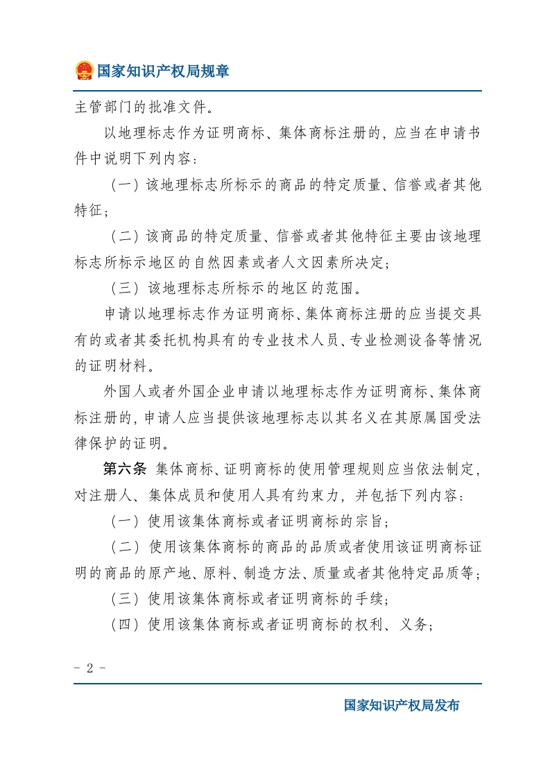 。国家知识产权局规章集体商标、证明商标注册和管理规定(2024年1月2日国家知识产权局令第79号公布自2024年2月1日起施行)第一条为了规范集体商标、证明商标的注册和使用管理,加强商标权益保护,维护社会公共利益,促进特色产业发展,根据《中华人民共和国商标法》(以下简称商标法)、《中华人民共和国商标法实施条例》(以下简称实施条例)的规定,制定本规定。第二条本规定有关商品的规定,适用于服务。第三条申请集体商标注册的,应当附送主体资格证明文件、集体成员的名称、地址和使用管理规则。申请以地理标志作为集体商标注册的团体、协会或者其他组织,其成员应当来自该地理标志标示的地区范围内。第四条申请证明商标注册的,应当附送主体资格证明文件、使用管理规则和证明其具有的或者其委托机构具有的专业技术人员、专业检测设备等情况的证明材料,以表明其具有监督该证明商标所证明的特定商品品质的能力。第五条申请以地理标志作为证明商标、集体商标注册的,应当附送管辖该地理标志所标示地区的县级以上人民政府或者-1-国家知识产权局发布