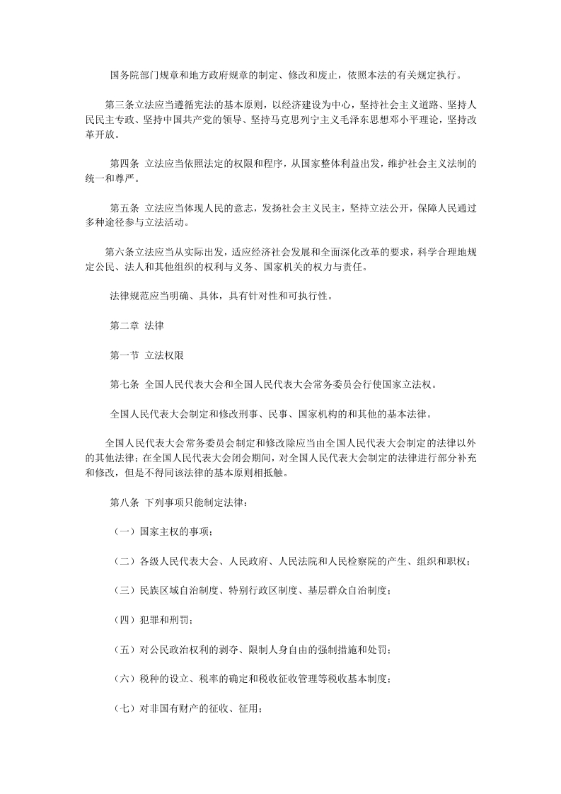 中华人民共和国立法法(2000年3月15日第九届全国人民代表大会第三次会议通过根据2015年3月15日第十二届全国人民代表大会第三次会议《关于修改(中华人民共和国立法法》的决定》修正)目录第一章总则第二章法律第一节立法权限第二节全国人民代表大会立法程序第三节全国人民代表大会常务委员会立法程序第四节法律解释第五节其他规定第三章行政法规第四章地方性法规、自治条例和单行条例、规章第一节地方性法规、自治条例和单行条例第二节规章第五章适用与备案审查第六章附则第一章总则第一条为了规范立法活动,健全国家立法制度,提高立法质量,完善中国特色社会主义法律体系,发挥立法的引领和推动作用,保障和发展社会主义民主,全面推进依法治国,建设社会主义法治国家,根据宪法,制定本法。第二条法律、行政法规、地方性法规、自治条例和单行条例的制定、修改和废止,适用本法。