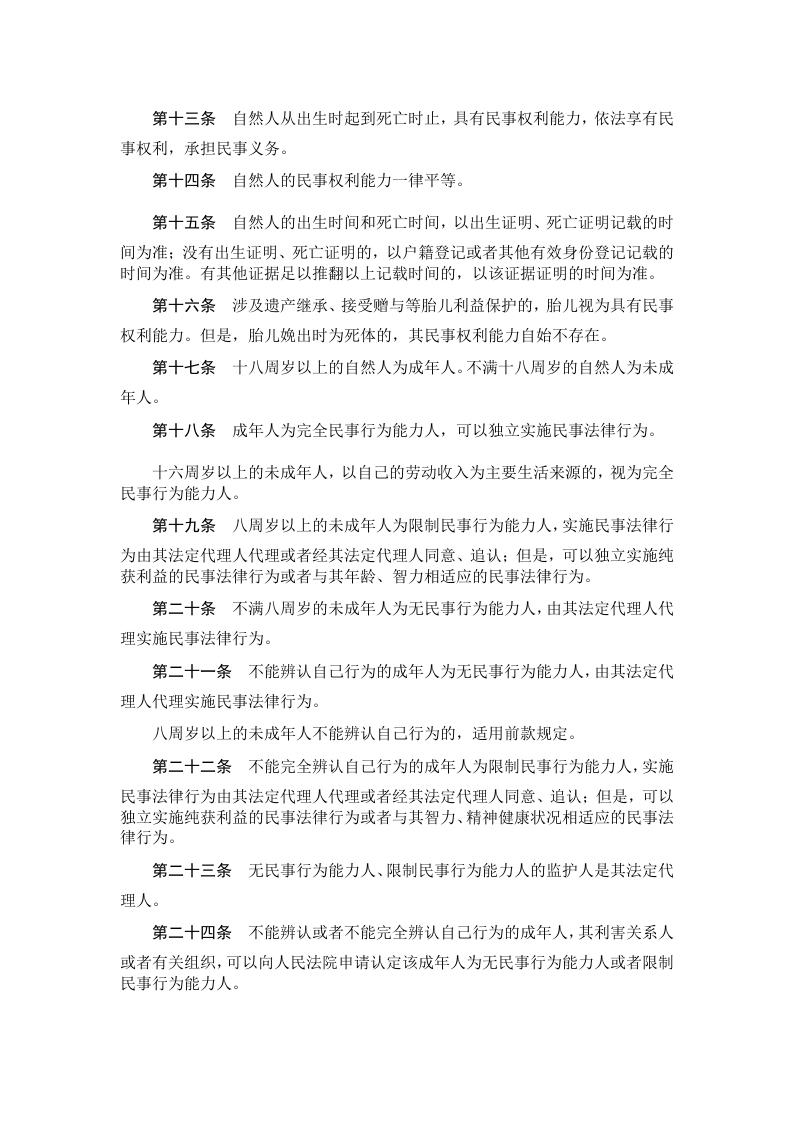 中华人民共和国民法典(2020年5月28日第十三届全国人民代表大会第三次会议通过)第一编总则第一章基本规定第一条为了保护民事主体的合法权益,调整民事关系,维护社会和经济秩序,适应中国特色社会主义发展要求,弘扬社会主义核心价值观,根据宪法,制定本法。第二条民法调整平等主体的自然人、法人和非法人组织之间的人身关系和财产关系。第三条民事主体的人身权利、财产权利以及其他合法权益受法律保护,任何组织或者个人不得侵犯。第四条民事主体在民事活动中的法律地位一律平等。第五条民事主体从事民事活动,应当遵循自愿原则,按照自己的意思设立、变更、终止民事法律关系。第六条民事主体从事民事活动,应当遵循公平原则,合理确定各方的权利和义务第七条民事主体从事民事活动,应当遵循诚信原则,秉持诚实,恪守承诺。第八条民事主体从事民事活动,不得违反法律,不得违背公序良俗。第九条民事主体从事民事活动,应当有利于节约资源、保护生态环境。第十条处理民事纠纷,应当依照法律:法律没有规定的,可以适用习惯,但是不得违背公序良俗。第十一条其他法律对民事关系有特别规定的,依照其规定。第十二条中华人民共和国领域内的民事活动,适用中华人民共和国法律。法律另有规定的,依照其规定。第二章自然人第一节民事权利能力和民事行为能力