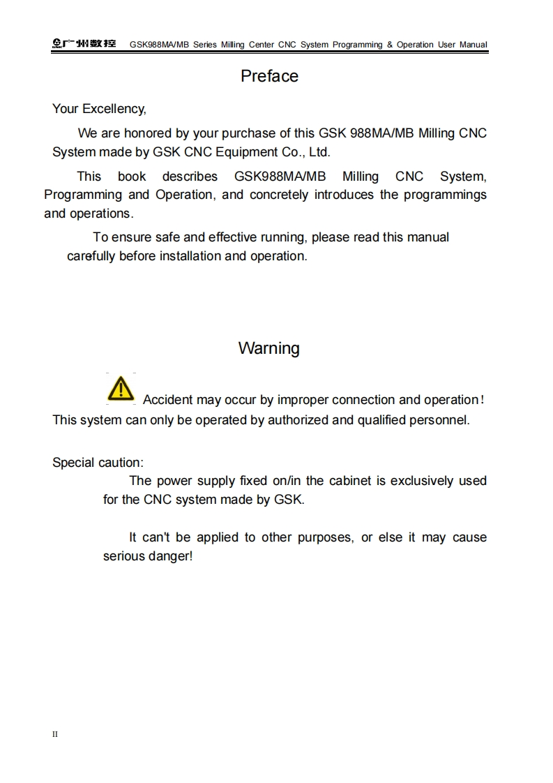 In this user manual we have tried to describe the mattersconcerning the operation of this CNC system to the greatest extent.However,it is impossible to give particular descriptions for allunnecessary or unallowable operations due to length limitation andproducts application conditions:Therefore,the items not presentedherein should be regarded as“impossible”or“unallowable”.米Copyright is reserved to GSK CNC Equipment Co.,Ltd.It isillegal for any organization or individual to publish or reprint this manual.GSK CNC Equipment Co.,Ltd.reserves the right to ascertain theirlegal liability.