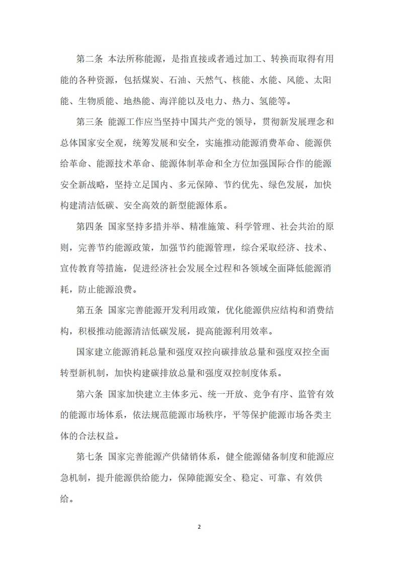 中华人民共和国能源法发文单位:全国人民代表大会常务委员会文号:主席令第三十七号效力范围:尚未生效发文日期:2024-11-08生效日期:2025-01-01《中华人民共和国能源法》已由中华人民共和国第十四届全国人民代表大会常务委员会第十二次会议于2024年11月8日通过,现予公布,自2025年1月1日起施行。中华人民共和国主席习近平2024年11月8日中华人民共和国能源法(2024年11月8日第十四届全国人民代表大会常务委员会第十二次会议通过)第一章总则第一条为了推动能源高质量发展,保障国家能源安全,促进经济社会绿色低碳转型和可持续发展,积极稳妥推进碳达峰碳中和,适应全面建设社会主义现代化国家需要,根据宪法,制定本法。