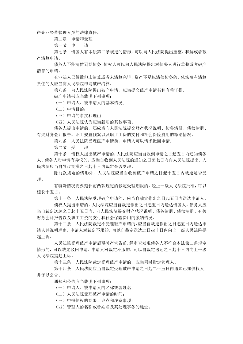 中华人民共和国企业破产法(2006年8月27日第十届全国人民代表大会常务委员会第二十三次会议通过)目录第一章总则第二章申请和受理第一节申请第二节受理第三章管理人第四章债务人财产第五章破产费用和共益债务第六章债权申报第七章债权人会议第一节一般规定第二节债权人委员会第八章重整第一节重整申请和重整期间第二节重整计划的制定和批准第三节重整计划的执行第九章和解第十章破产清算第一节破产宣告第二节变价和分配第三节破产程序的终结第十一章法律责任第十二章附则第一章总则第一条为规范企业破产程序,公平清理债权债务,保护债权人和债务人的合法权益,维护社会主义市场经济秩序,制定本法。第二条企业法人不能清偿到期债务,并且资产不足以清偿全部债务或者明显缺乏清偿能力的,依照本法规定清理债务。企业法人有前款规定情形,或者有明显丧失清偿能力可能的,可以依照本法规定进行重整第三条破产案件由债务人住所地人民法院管辖。第四条破产案件审理程序,本法没有规定的,适用民事诉讼法的有关规定。第五条依照本法开始的破产程序,对债务人在中华人民共和国领域外的财产发生效力。对外国法院作出的发生法律效力的破产案件的判决、裁定,涉及债务人在中华人民共和国领域内的财产,申请或者请求人民法院承认和执行的,人民法院依照中华人民共和国缔结或者参加的国际条约,或者按照互惠原则进行审查,认为不违反中华人民共和国法律的基本原则,不损害国家主权、安全和社会公共利益,不损害中华人民共和国领域内债权人的合法权益的,裁定承认和执行。第六条人民法院审理破产案件,应当依法保障企业职工的合法权益,依法追究破
