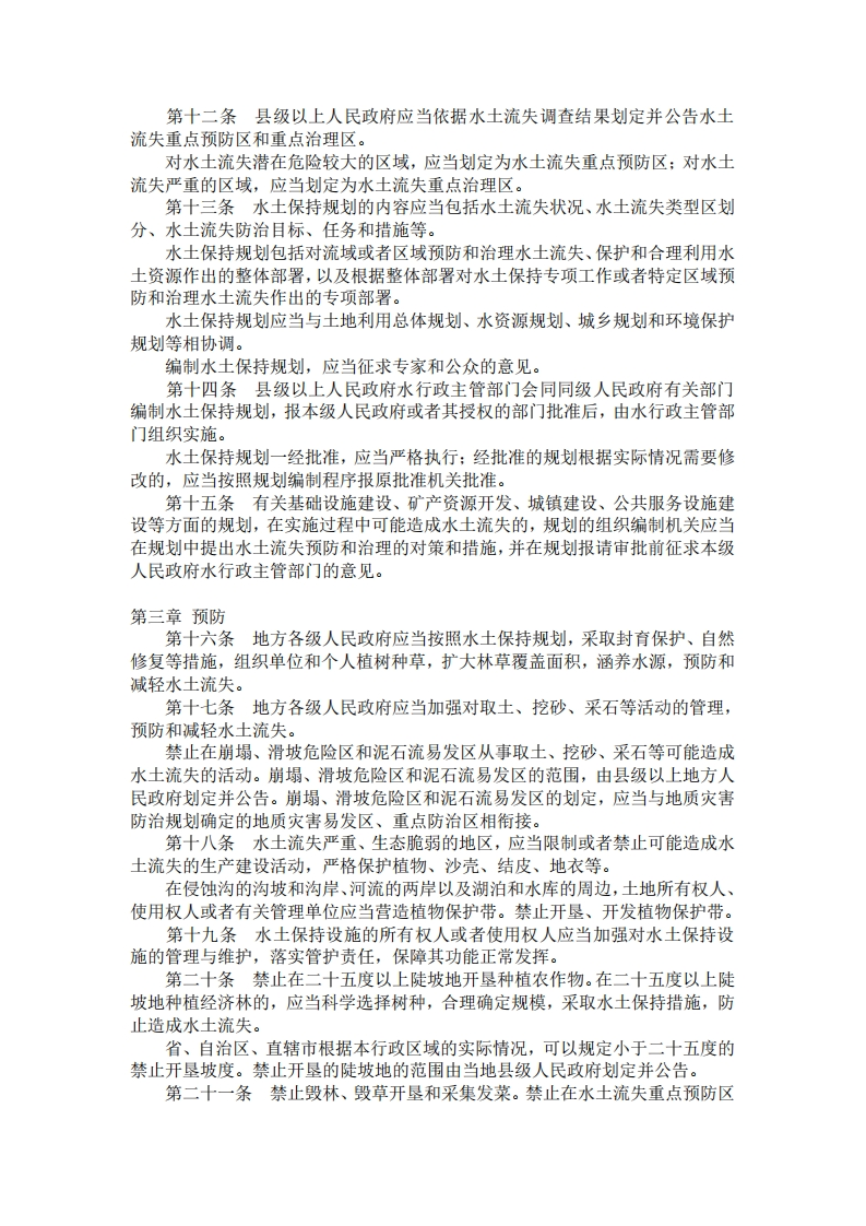 中华人民共和国水土保持法(1991年6月29日第七届全国人民代表大会常务委员会第二十次会议通过根据2009年8月27日第十一届全国人民代表大会常务委员会第十次会议《关于修改部分法律的决定》修正2010年12月25日第十一届全国人民代表大会常务委员会第十八次会议修订)第一章总则第一条为了预防和治理水土流失,保护和合理利用水土资源,减轻水、旱、风沙灾害,改善生态环境,保障经济社会可持续发展,制定本法。第二条在中华人民共和国境内从事水土保持活动,应当遵守本法。本法所称水土保持,是指对自然因素和人为活动造成水土流失所采取的预防和治理措施。第三条水土保持工作实行预防为主、保护优先、全面规划、综合治理、因地制宜、突出重点、科学管理、注重效益的方针。第四条县级以上人民政府应当加强对水土保持工作的统一领导,将水土保持工作纳入本级国民经济和社会发展规划,对水土保持规划确定的任务,安排专项资金,并组织实施。国家在水土流失重点预防区和重点治理区,实行地方各级人民政府水土保持目标责任制和考核奖惩制度。第五条国务院水行政主管部门主管全国的水土保持工作。国务院水行政主管部门在国家确定的重要江河、湖泊设立的流域管理机构(以下简称流域管理机构),在所管辖范围内依法承担水土保持监督管理职责。县级以上地方人民政府水行政主管部门主管本行政区域的水土保持工作。县级以上人民政府林业、农业、国土资源等有关部门按照各自职责,做好有关的水土流失预防和治理工作。第六条各级人民政府及其有关部门应当加强水土保持宣传和教育工作,普及水土保持科学知识,增强公众的水土保持意识。第七条国家鼓励和支持水土保持科学技术研究,提高水土保持科学技术水平,推广先进的水土保持技术,培养水土保持科学技术人才。第八条任何单位和个人都有保护水土资源、预防和治理水土流失的义务,并有权对破坏水土资源、造成水土流失的行为进行举报。第九条国家鼓励和支持社会力量参与水土保持工作。对水土保持工作中成绩显著的单位和个人,由县级以上人民政府给予表彰和奖励。第二章规划第十条水土保持规划应当在水土流失调查结果及水土流失重点预防区和重点治理区划定的基础上,遵循统筹协调、分类指导的原则编制。第十一条国务院水行政主管部门应当定期组织全国水土流失调查并公告调查结果。省、自治区、直辖市人民政府水行政主管部门负责本行政区域的水土流失调查并公告调查结果,公告前应当将调查结果报国务院水行政主管部门备案。