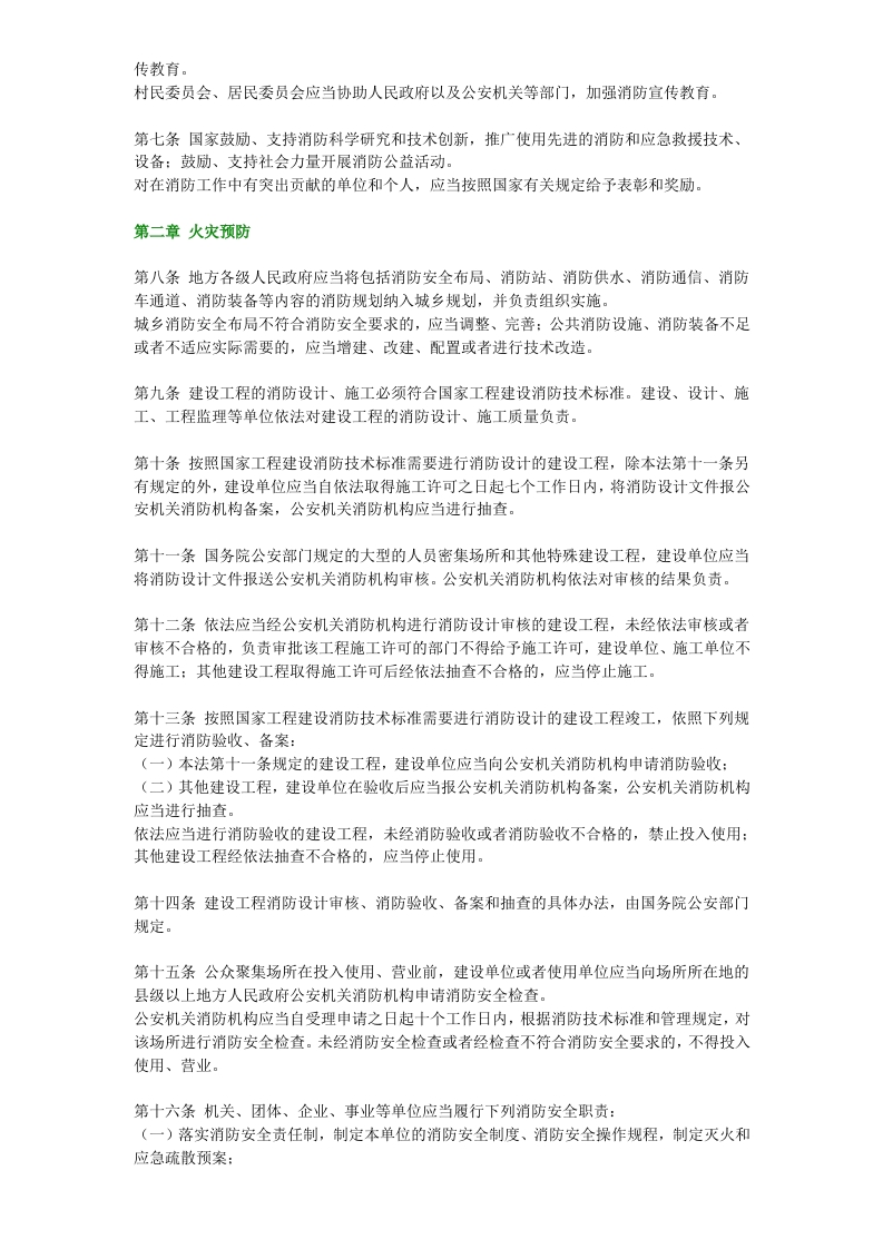 中华人民共和国消防法(1998年4月29日第九届全国人民代表大会常务委员会第二次会议通过2008年10月28日第十一届全国人民代表大会常务委员会第五次会议修订)目录第一章总则第二章火灾预防第三章消防组织第四章灭火救援第五章监督检查第六章法律责任第七章附则第一章总则第一条为了预防火灾和减少火灾危害,加强应急救援工作,保护人身、财产安全,维护公共安全,制定本法。第二条消防工作贯彻预防为主、防消结合的方针,按照政府统一领导、部门依法监管、单位全面负责、公民积极参与的原则,实行消防安全责任制,建立健全社会化的消防工作网络。第三条国务院领导全国的消防工作。地方各级人民政府负责本行政区域内的消防工作。各级人民政府应当将消防工作纳入国民经济和社会发展计划,保障消防工作与经济社会发展相适应。第四条国务院公安部门对全国的消防工作实施监督管理。县级以上地方人民政府公安机关对本行政区域内的消防工作实施监督管理,并由本级人民政府公安机关消防机构负责实施。军事设施的消防工作,由其主管单位监督管理,公安机关消防机构协助:矿井地下部分、核电厂、海上石油天然气设施的消防工作,由其主管单位监督管理。县级以上人民政府其他有关部门在各自的职责范围内,依照本法和其他相关法律、法规的规定做好消防工作。法律、行政法规对森林、草原的消防工作另有规定的,从其规定。第五条任何单位和个人都有维护消防安全、保护消防设施、预防火灾、报告火警的义务。任何单位和成年人都有参加有组织的灭火工作的义务。第六条各级人民政府应当组织开展经常性的消防宣传教育,提高公民的消防安全意识。机关、团体、企业、事业等单位,应当加强对本单位人员的消防宣传教育。公安机关及其消防机构应当加强消防法律、法规的宣传,并督促、指导、协助有关单位做好消防宣传教育工作。教育、人力资源行政主管部门和学校、有关职业培训机构应当将消防知识纳入教育、教学、培训的内容。新闻、广播、电视等有关单位,应当有针对性地面向社会进行消防宣传教育。工会、共产主义青年团、妇女联合会等团体应当结合各自工作对象的特点,组织开展消防宣