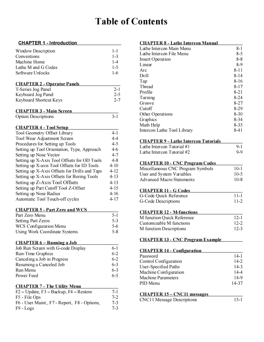 CENTROIDT4005T39Operators ManualCentroid T-Series Lathe Operators ManualCNC Software version:CNC11 V.3.16Models:T400 T39©CENTROIDT=00:02:43 Graching Done Job NaT:T400-PIC.LTH,a目aG陋图图Introduction1-1Operators Panel2-1Main Screen3-1Tool Setup4-1Part zero and WCS51Running a Job6-1Utility Menu7-1Intercon Conversational Programming8-1Intercon Tutorials9-1CNC Program codes10-1G-Codes11-1M code functions12-1CNC Program Examples13-1Configuration14-1www.centroidcnc.comCNC Software Messages15-1v3.16_CENTROID_lathe_operators_manual.pdf 11-2-16 Copyright 2013-2016 CENTROIDU.S.Patent #6490500