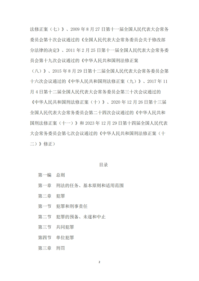 中华人民共和国刑法(2023年)发文单位:全国人民代表大会及其常务委员会文号:(无文号)效力范围:全文有效发文日期:2023-12-29生效日期:2024-03-01(1979年7月1日第五届全国人民代表大会第二次会议通过1997年3月14日第八届全国人民代表大会第五次会议修订根据1998年12月29日第九届全国人民代表大会常务委员会第六次会议通过的《全国人民代表大会常务委员会关于惩治骗购外汇、逃汇和非法买卖外汇犯罪的决定》、1999年12月25日第九届全国人民代表大会常务委员会第十三次会议通过的《中华人民共和国刑法修正案》、2001年8月31日第九届全国人民代表大会常务委员会第二十三次会议通过的《中华人民共和国刑法修正案(二)》、2001年12月29日第九届全国人民代表大会常务委员会第二十五次会议通过的《中华人民共和国刑法修正案(三)》、2002年12月28日第九届全国人民代表大会常务委员会第三十一次会议通过的《中华人民共和国刑法修正案(四)》、2005年2月28日第十届全国人民代表大会常务委员会第十四次会议通过的《中华人民共和国刑法修正案(五)》、2006年6月29日第十届全国人民代表大会常务委员会第二十二次会议通过的《中华人民共和国刑法修正案(六)》、2009年2月28日第十一届全国人民代表大会常务委员会第七次会议通过的《中华人民共和国刑