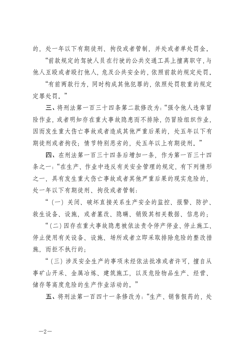中华人民共和国刑法修正案(十一)(2020年12月26日第十三届全国人民代表大会常务委员会第二十四次会议通过)一、将刑法第十七条修改为:“已满十六周岁的人犯罪,应当负刑事责任。“已满十四周岁不满十六周岁的人,犯故意杀人、故意伤害致人重伤或者死亡、强奸、抢劫、贩卖毒品、放火、爆炸、投放危险物质罪的,应当负刑事责任。“已满十二周岁不满十四周岁的人,犯故意杀人、故意伤害罪,致人死亡或者以特别残忍手段致人重伤造成严重残疾,情节恶劣,经最高人民检察院核准追诉的,应当负刑事责任。“对依照前三款规定追究刑事责任的不满十八周岁的人,应当从轻或者减轻处罚。“因不满十六周岁不予刑事处罚的,责令其父母或者其他监护人加以管教;在必要的时候,依法进行专门矫治教育。”二、在刑法第一百三十三条之一后增加一条,作为第一百三十三条之二:“对行驶中的公共交通工具的驾驶人员使用暴力或者抢控驾驶操纵装置,干扰公共交通工具正常行驶,危及公共安全-1-
