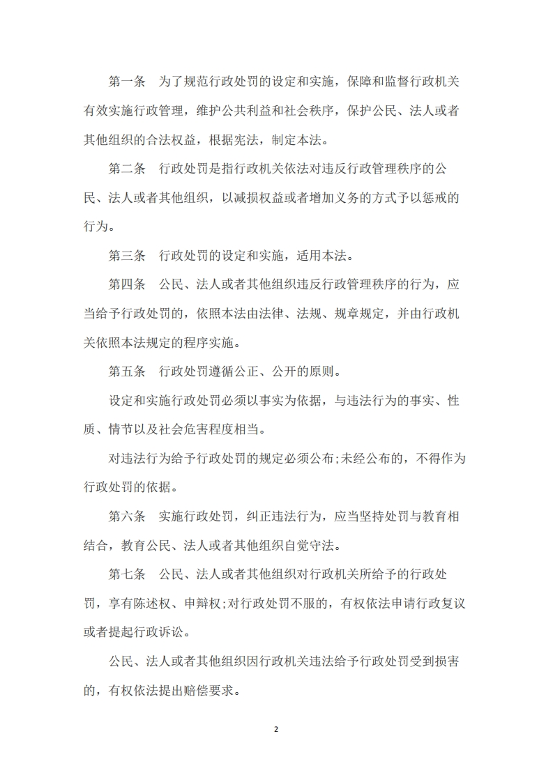 中华人民共和国行政处罚法(2021修正)发文单位:全国人民代表大会文号:中华人民共和国主席令第七十号效力范围:全文有效发文日期:2021-01-22生效日期:2021-07-15《中华人民共和国行政处罚法》已由中华人民共和国第十三届全国人民代表大会常务委员会第二十五次会议于2021年1月22日修订通过,现予公布,自2021年7月15日起施行。中华人民共和国主席习近平2021年1月22日(1996年3月17日第八届全国人民代表大会第四次会议通过根据2009年8月27日第十一届全国人民代表大会常务委员会第十次会议《关于修改部分法律的决定》第一次修正根据2017年9月1日第十二届全国人民代表大会常务委员会第二十九次会议《关于修改(中华人民共和国法官法)等八部法律的决定》第二次修正2021年1月22日第十三届全国人民代表大会常务委员会第二十五次会议修订)第一章总则1