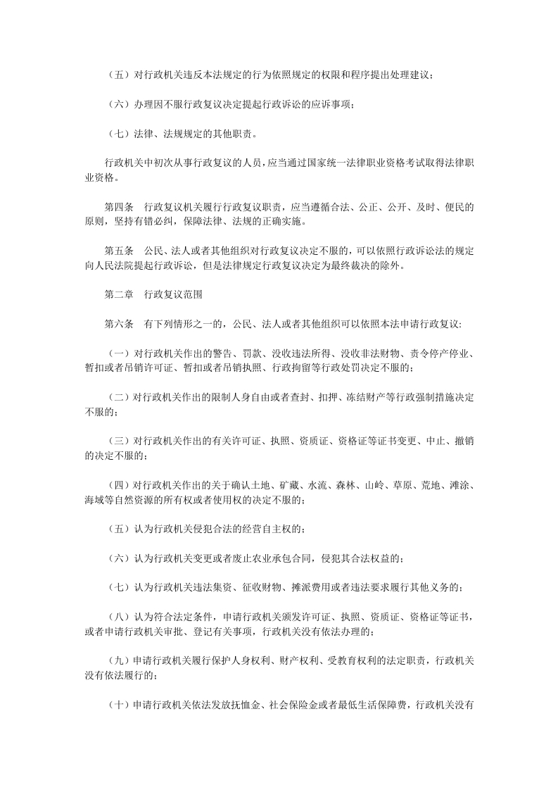 中华人民共和国行政复议法(1999年4月29日第九届全国人民代表大会常务委员会第九次会议通过根据2009年8月27日第十一届全国人民代表大会常务委员会第十次会议《关于修改部分法律的决定》第一次修正根据2017年9月1日第十二届全国人民代表大会常务委员会第二十九次会议《关于修改〈中华人民共和国法官法》等八部法律的决定》第二次修正)目录第一章总则第二章行政复议范围第三章行政复议申请第四章行政复议受理第五章行政复议决定第六章法律责任第七章附则第一章总则第一条为了防止和纠正违法的或者不当的具体行政行为,保护公民、法人和其他组织的合法权益,保障和监督行政机关依法行使职权,根据宪法,制定本法。第二条公民、法人或者其他组织认为具体行政行为侵犯其合法权益,向行政机关提出行政复议申请,行政机关受理行政复议申请、作出行政复议决定,适用本法。第三条依照本法履行行政复议职责的行政机关是行政复议机关。行政复议机关负责法制工作的机构具体办理行政复议事项,履行下列职责:(一)受理行政复议申请:(二)向有关组织和人员调查取证,查阅文件和资料:(三)审查申请行政复议的具体行政行为是否合法与适当,拟订行政复议决定:(四)处理或者转送对本法第七条所列有关规定的审查申请: